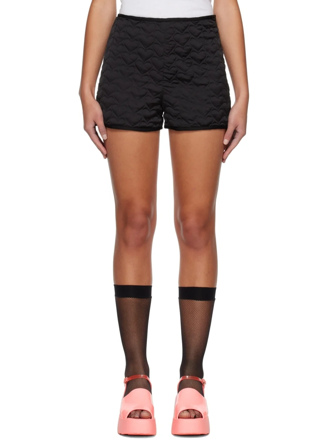 Quilted polyester satin shorts. · Graphic pattern throughout · Zip closure at outseam Supplier color: Black 100% polyester. Made in United States 231894F088002