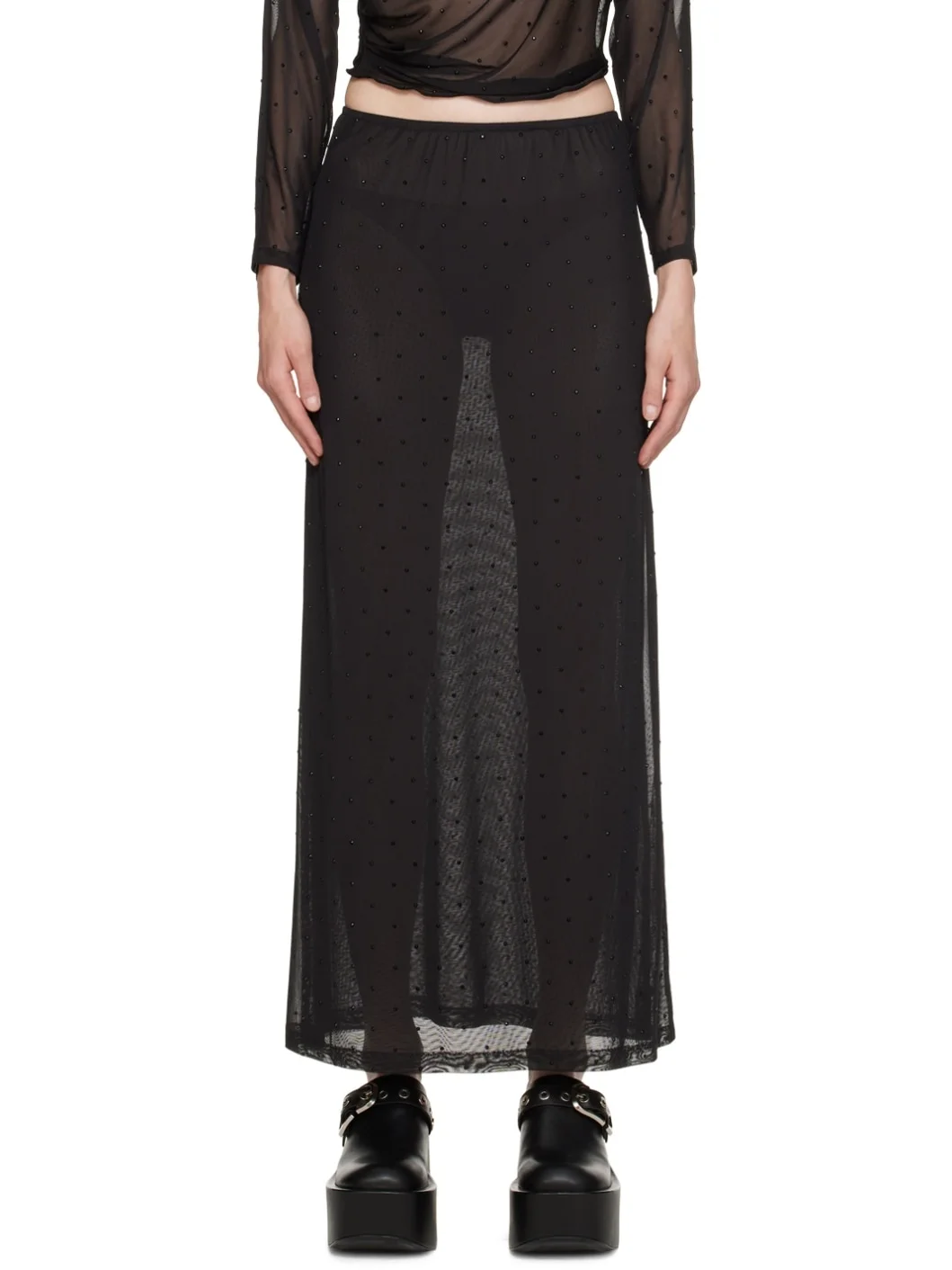 Semi-sheer stretch polyester mesh skirt. Crystal-cut appliques throughout. · Elasticized waistband · Slit at side seam · Fully lined Supplier color: Black Body: 95% polyester, 5% spandex. Lining: 80% polyester, 20% spandex. Made in United States 241894F093001