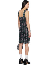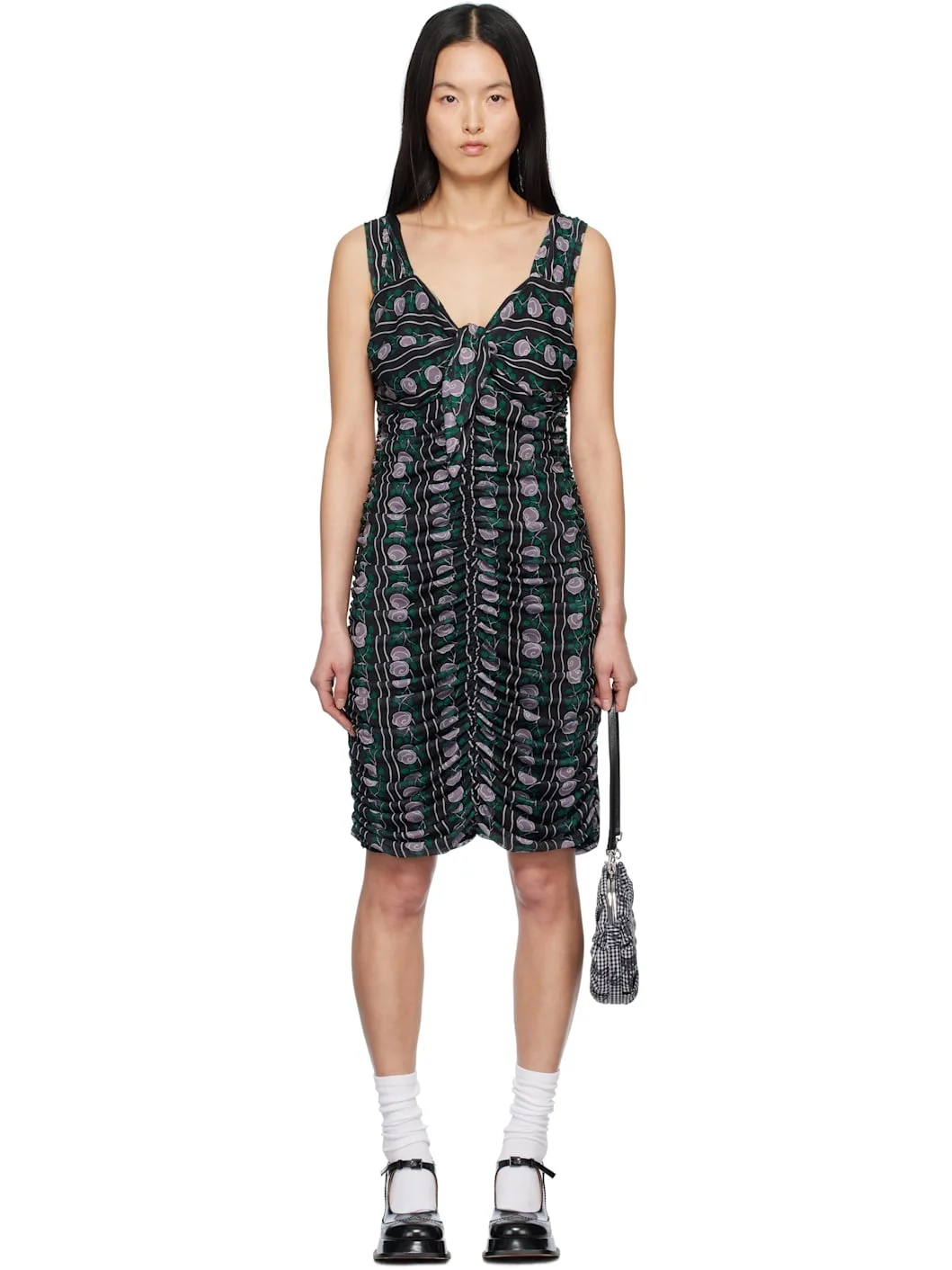Stretch polyester mesh midi dress. Ruching and printed graphic pattern throughout. · V-neck · Self-tie detailing at chest · Low back · Full jersey lining Supplier color: Black/Lilac multi Body: 92% polyester, 8% elastane. Lining: 100% polyester. Made in United States 251894F054001