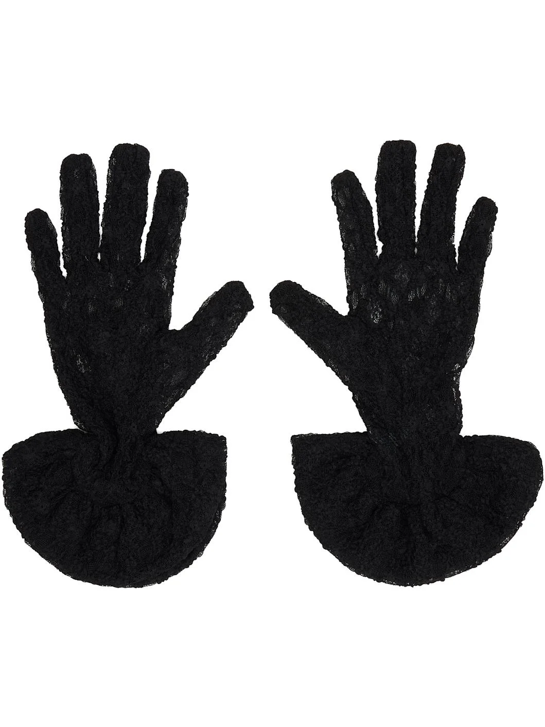 Pair of stretch lace gloves in black. Jacquard floral pattern throughout. Supplier color: Black