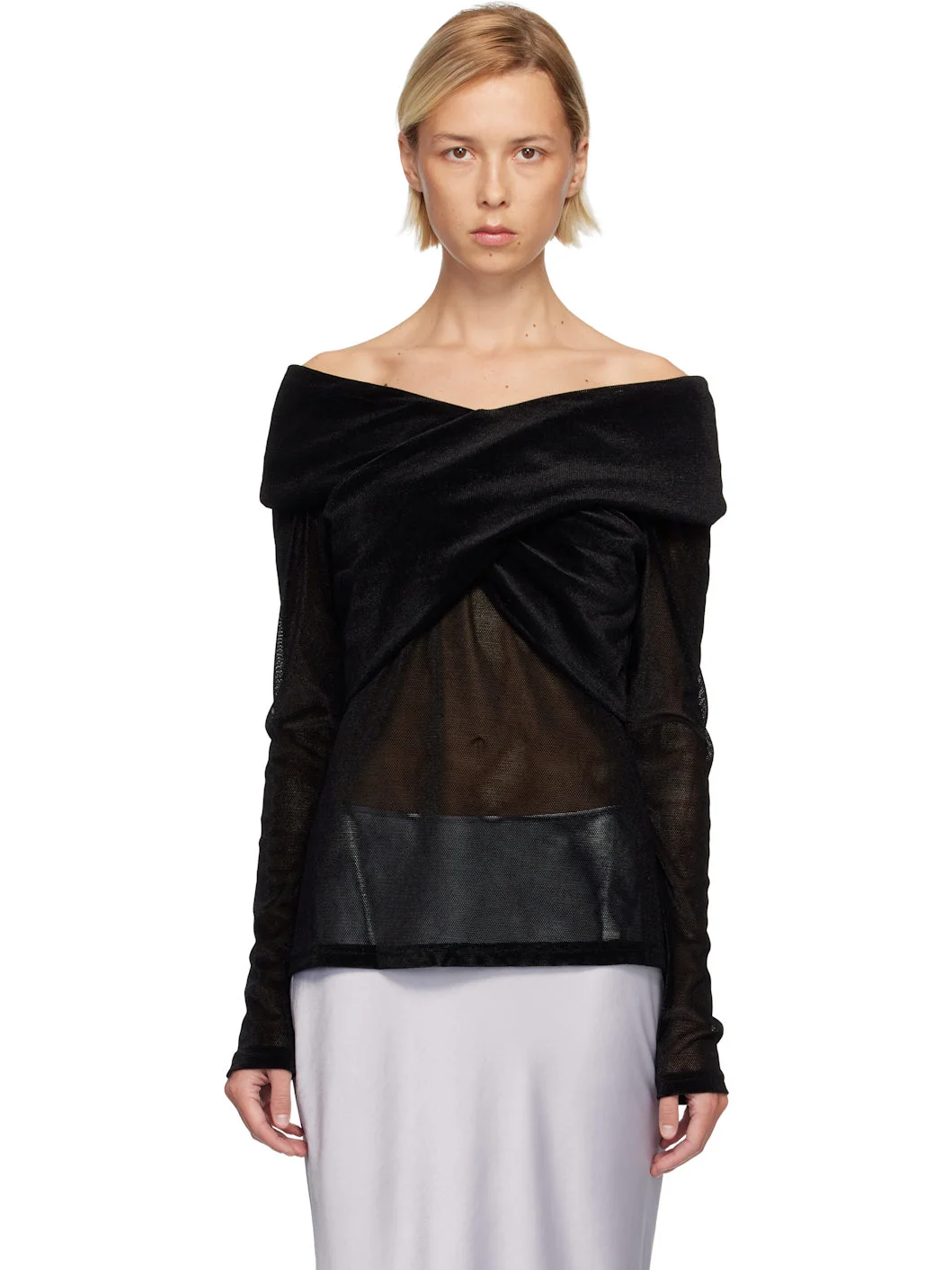 Paneled velvet and sheer flocked mesh top. · Off-the-shoulder construction · Crisscrossing panels at chest and back Supplier color: Black 100% polyester. Made in United States 252894F110002