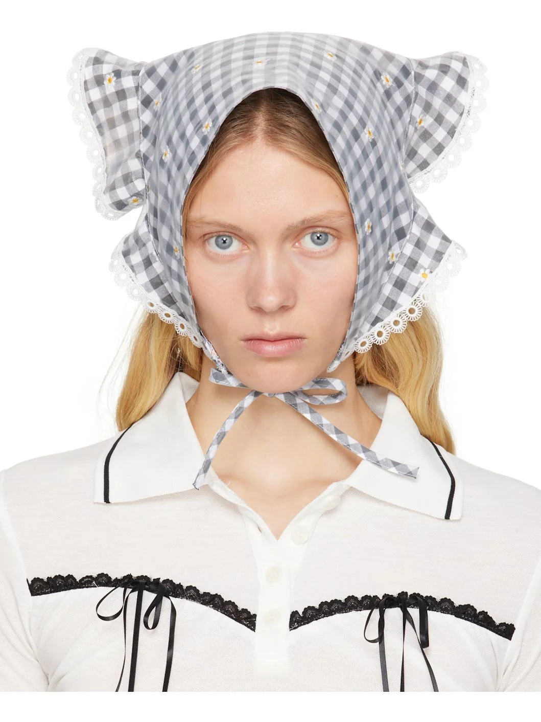 Plain-woven and organza headscarf in black and white. · Gingham and embroidered floral pattern throughout · Lace detailing and ruffles at scalloped edges · Self-tie cinch strap · H13.5" x W19" Supplier color: Black/Multi 100% polyester. Made in United States 251894F018006