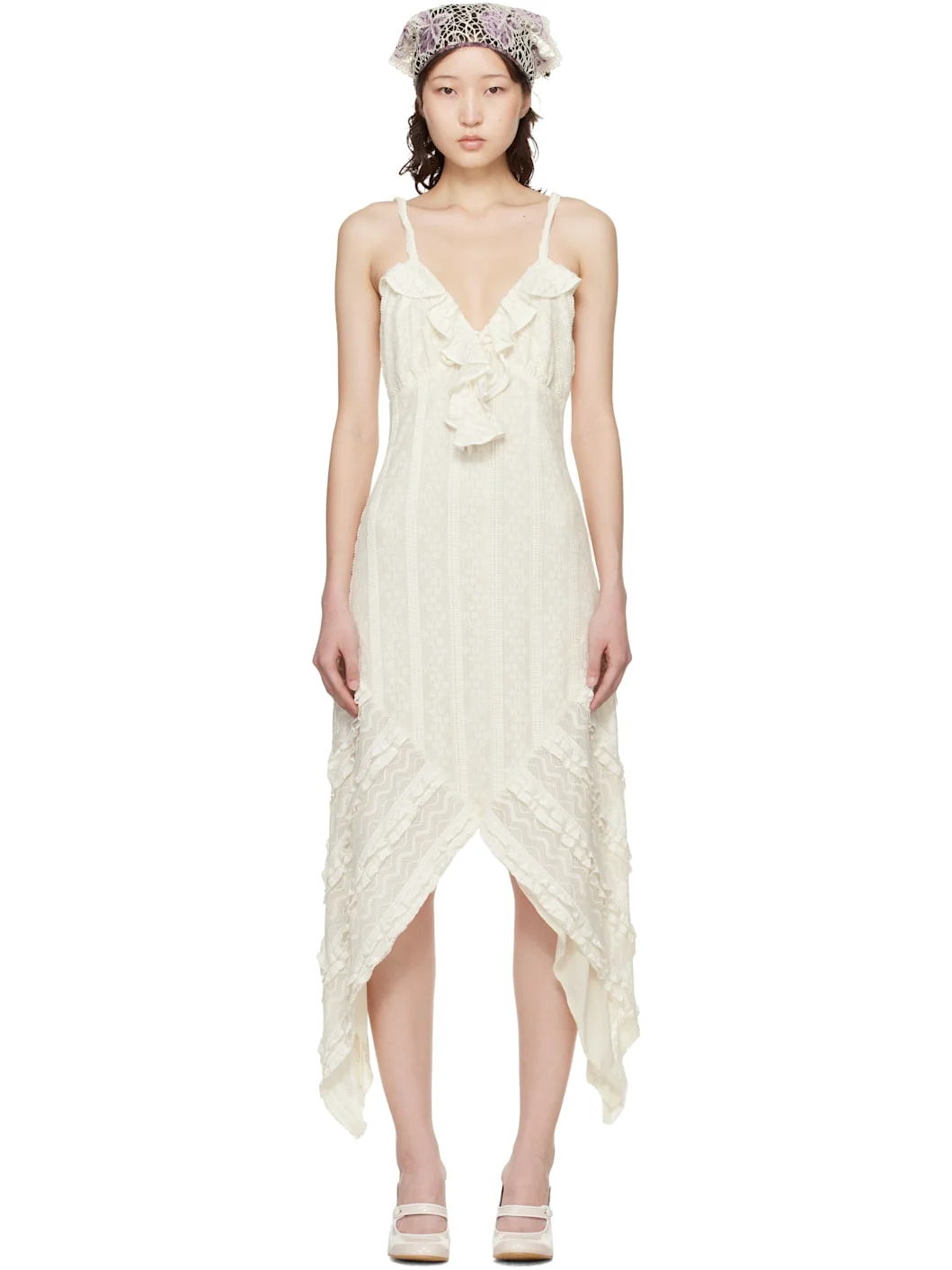 Off-White Floral Ruffle Stretch Lace Handkerchief Midi Dress