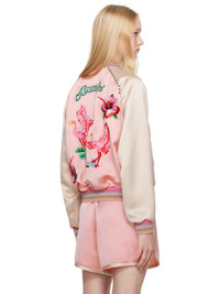 Polyester satin bomber jacket. · Striped rib-knit stand collar, hem, and cuffs · Zip closure · Graphic embroidered at chest · Welt pockets · Striped piping at raglan sleeves · Logo and graphics embroidered at back Supplier color: Pastel pink 100% polyester. Made in United States 251894F058000