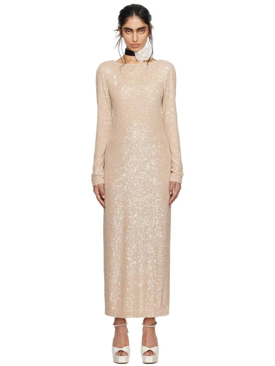 Sequinned stretch polyester mesh dress. · Round neck · Self-tie straps at open back · Central vent at back hem · Full stretch mesh lining Part of the exclusive SSENSE Bridal capsule. Supplier color: Champagne Body: 95% polyester, 5% spandex. Lining: 80% polyester, 20% spandex. Made in United States 242894F054001