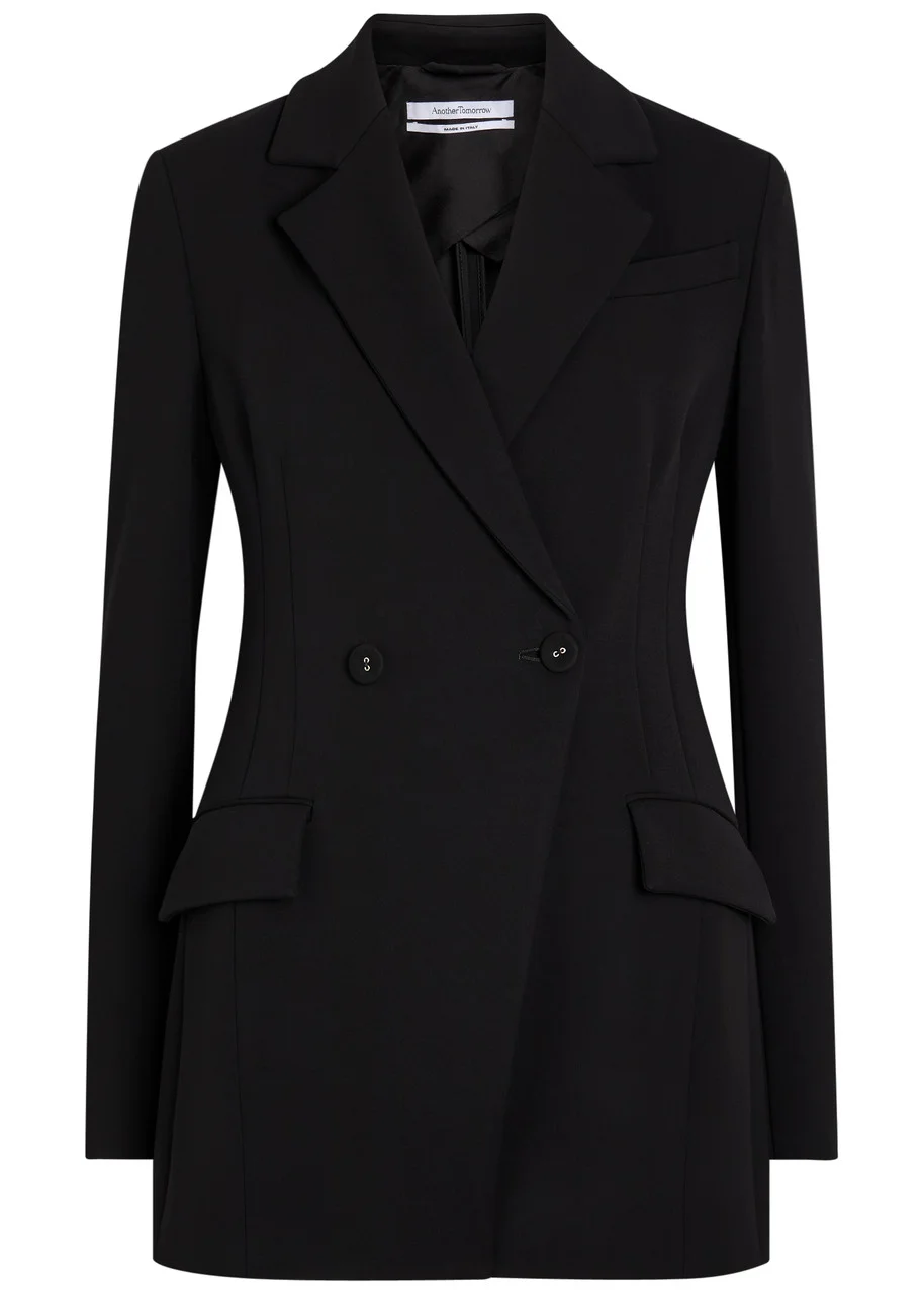 Info & Care Another Tomorrow jersey;blazer Notched lapels, lightly padded shoulders, faux chest slit pocket, darts through waist, front flap pockets, back vent, fully lined Double-breasted button fastenings at front 91%;viscose, 9% elastane; lining: 60% viscose, 35% cupro, 5% elastane Dry clean Coordinating items available Size & Fit Length shoulder to hem: 29 inches/ 73.5cm Midweight Regular fit, longline Fitted at the waist Model is 5'9"/ 175cm and wears a size;IT40