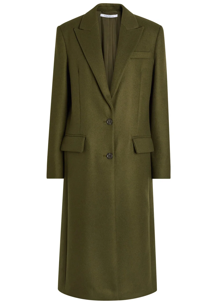 Info & Care Another Tomorrow wool coat Peaked;lapels, padded shoulders, button-fastening cuffs, darted, faux chest pocket, front flap pockets, back vent, internal slit pocket, fully lined Button fastenings at front 100% virgin wool; lining: 100% viscose Dry clean Size & Fit Length shoulder to hem: 47 inches/ 119.5cm Midweight Relaxed fit Model is 5'10"/ 178cm and wears a size;small