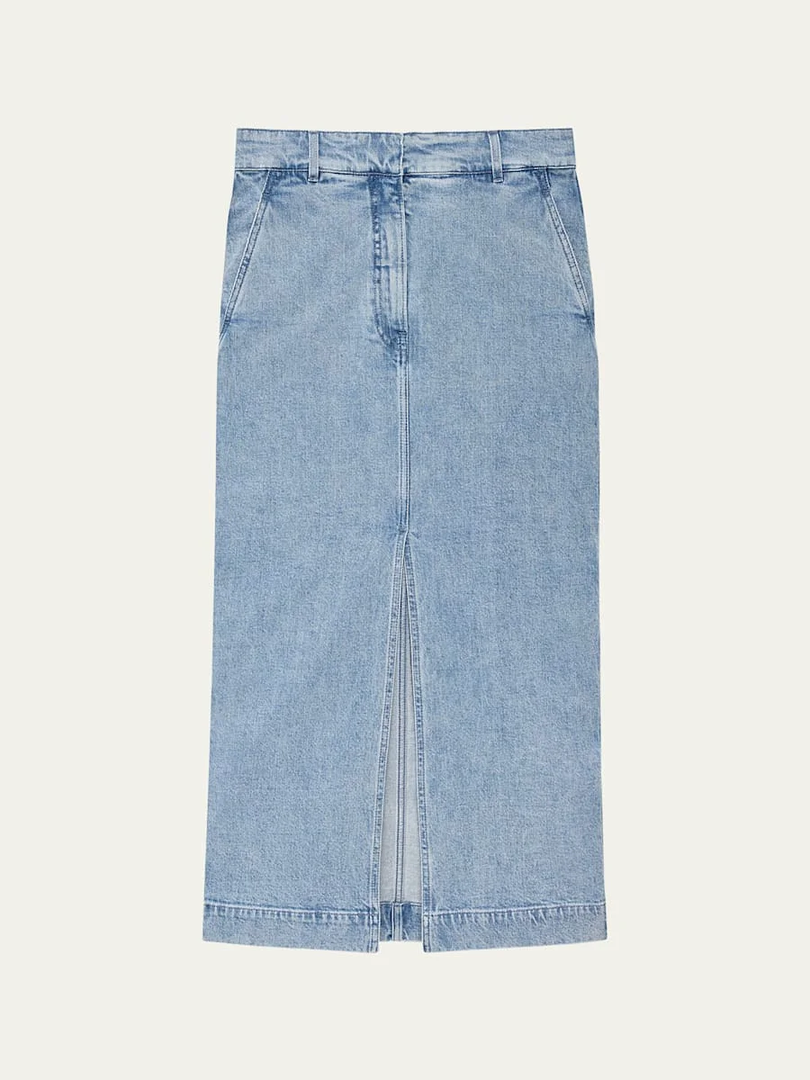 Another Tomorrow denim skirt High waist Side slip pockets; back patch pockets Pencil silhouette Long length Center front slit Tab/zip fly; belt loops Slit Length (inches): 8 Cotton/elastane Machine wash line dry Made in Italy Model is 5'10"/177cm. Online Inquiries: BGS21_B92A7| Store Inquiries: #4727283