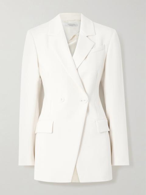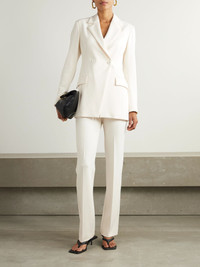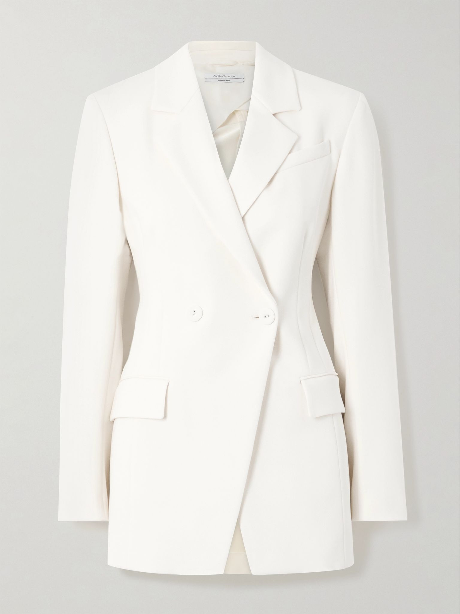 Another Tomorrow's collections of foundational basics are crafted from responsibly sourced fabrics. This blazer is tailored from jersey and designed with an asymmetric double-breasted front that nips in at the waist. Wear yours with the coordinating pants. Lower-Impact Materials. This product is made using at least 50% lower-impact materials or ingredients. Find out more about our NET SUSTAIN criteria here. Size & Fit - Fits true to size, take your normal size - Designed for a slim fit - Mid-weight, slightly stretchy fabric - Model is 180cm/ 5'11" and is wearing an IT 40 Details & Care - White jersey - Partially concealed button fastenings through double-breasted front - 91% viscose, 9% elastane