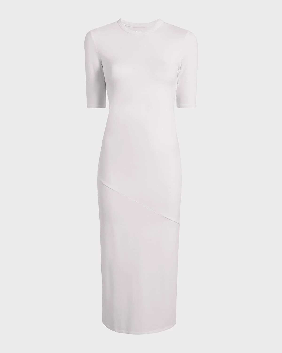 Another Tomorrow fitted midi dress with an asymmetric seam detail Approx. 48" from shoulder to hem Crew neckline 3/4 sleeves; approx. 10.4"L Hem falls below the knee Fitted silhouette Tencel® lyocell/cotton/elastane Made in Portugal