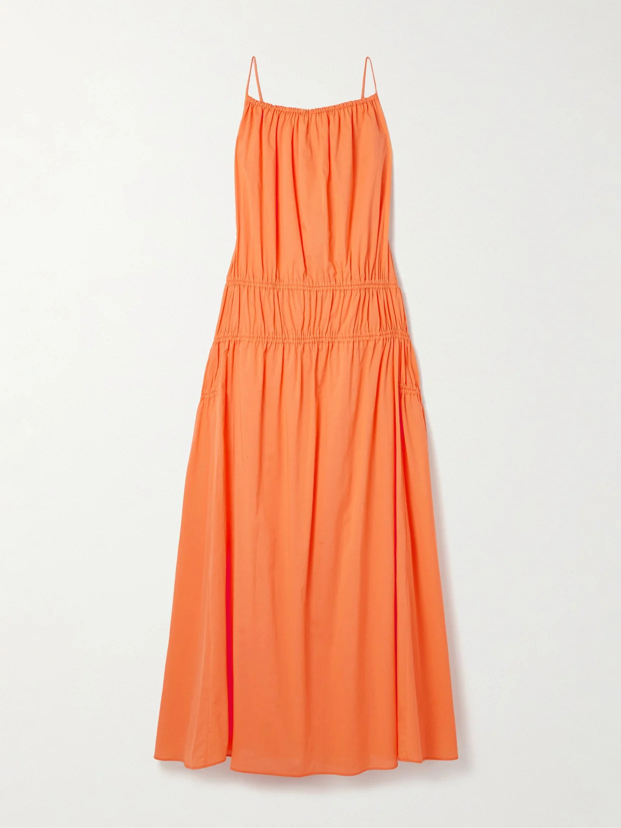 Another Tomorrow is a name to know for simple and sculptural designs. This maxi dress is cut from orange organic cotton-poplin that's gathered along the neckline and hips, creating a floaty, tiered shape. It turns to reveal a scooped back and rests on pin-thin straps. Large to size. See Size & Fit notes.