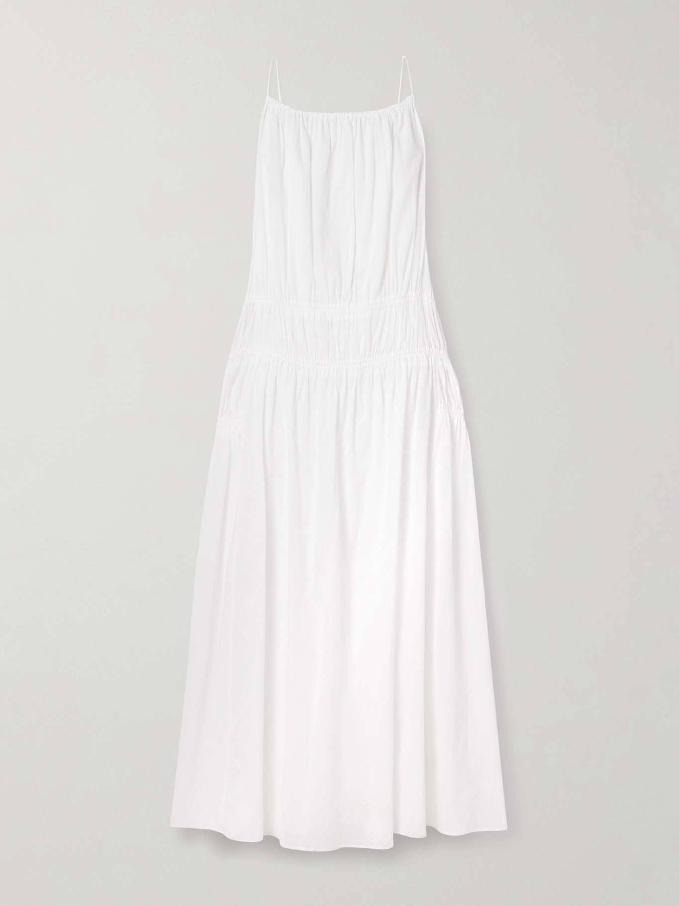 EDITORS'NOTES Another Tomorrow is a name to know for simple and sculptural designs. This maxi dress is cut from white cotton-poplin that's gathered along the neckline and hips, creating a floaty, tiered shape. It turns to reveal a scooped back and rests on pin-thin straps. Large to size. See Size & Fit notes. SIZE & FIT Model measurements: - Fits large to size, take one size smaller than normal - Designed for a loose fit - Lightweight, non-stretchy fabric - Model is 175cm/ 5'9" and is wearing a size Small - Bust: 79cm/ 31" - Waist: 61cm/ 24" - Hip: 89cm/ 35" DETAILS & CARE - White cotton-poplin - Slips on - 100% cotton - Dry clean