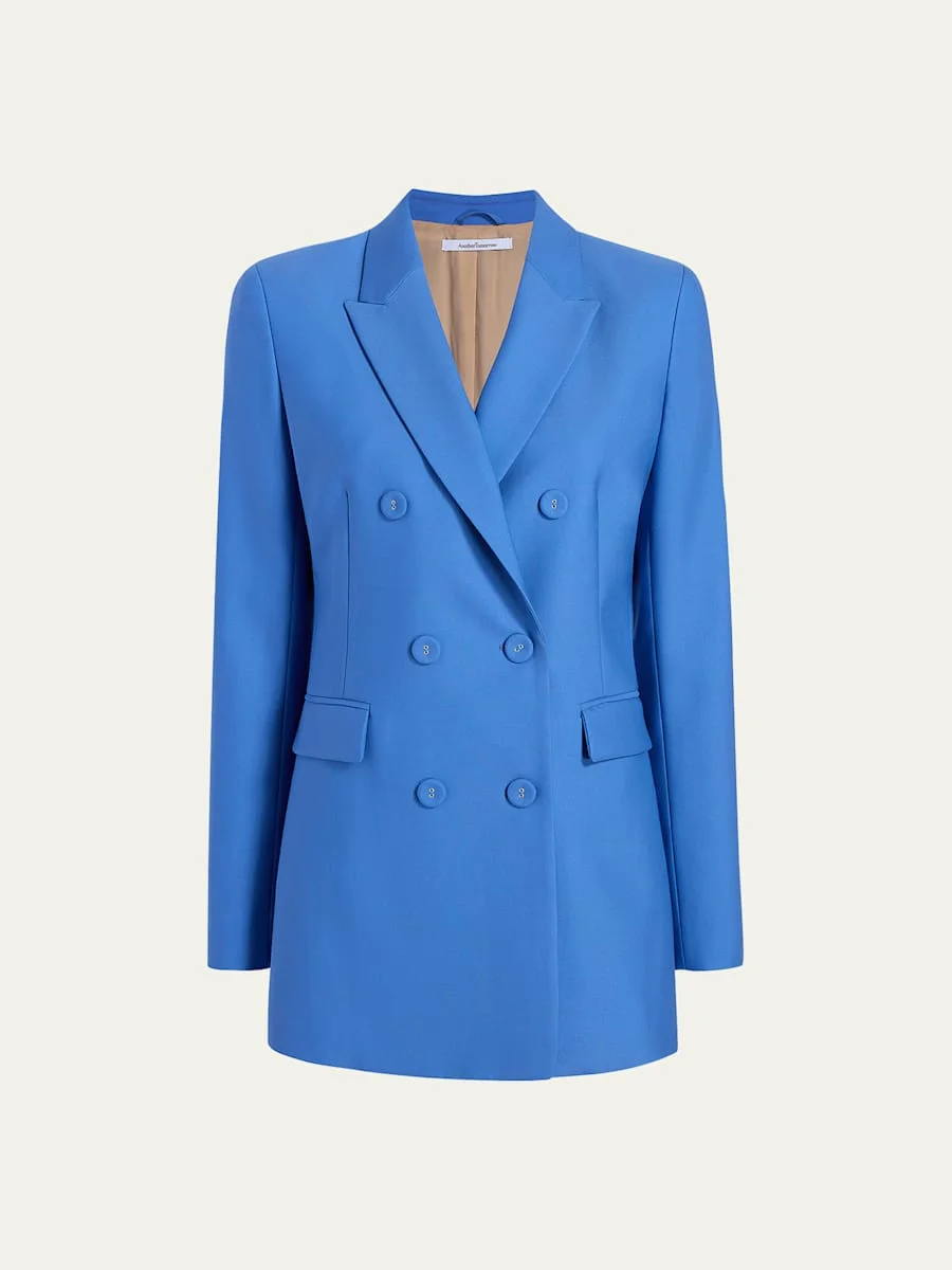 Another Tomorrow merino wool blazer jacket with fabric-covered buttons Approx. 29.4" from shoulder to hem Double-breasted front Peak lapel collar Button front Long sleeves Front flap pockets Back side slits Mid-length Relaxed fit Custom-made ethical merino wool sourced to the farm Wool/elastane Lining: Cupro Dry clean Made in Italy Model is 5'10"/177cm. Online Inquiries: BGS21_B80HD| Store Inquiries: #4449680