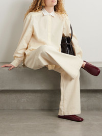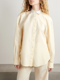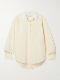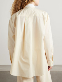 "We hold ourselves to the highest standards when selecting materials for our designs", says Another Tomorrow - this shirt is cut from organic cotton-poplin that's grown without synthetic pesticides and GMO seeds. The effortless, relaxed shape is emphasized by a curved step hem and single back pleat. Size & Fit - Fits true to size, take your normal size - Designed for a loose fit - Lightweight, non-stretchy fabric - Model is 175cm/ 5'9" and is wearing a size Small Model measurements: - Bust: 74cm/ 29" - Waist: 61cm/ 24" - Hip: 89cm/ 35" Details & Care - Off-white and white cotton-poplin - Button fastenings through front - 100% organic cotton - Hand wash