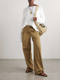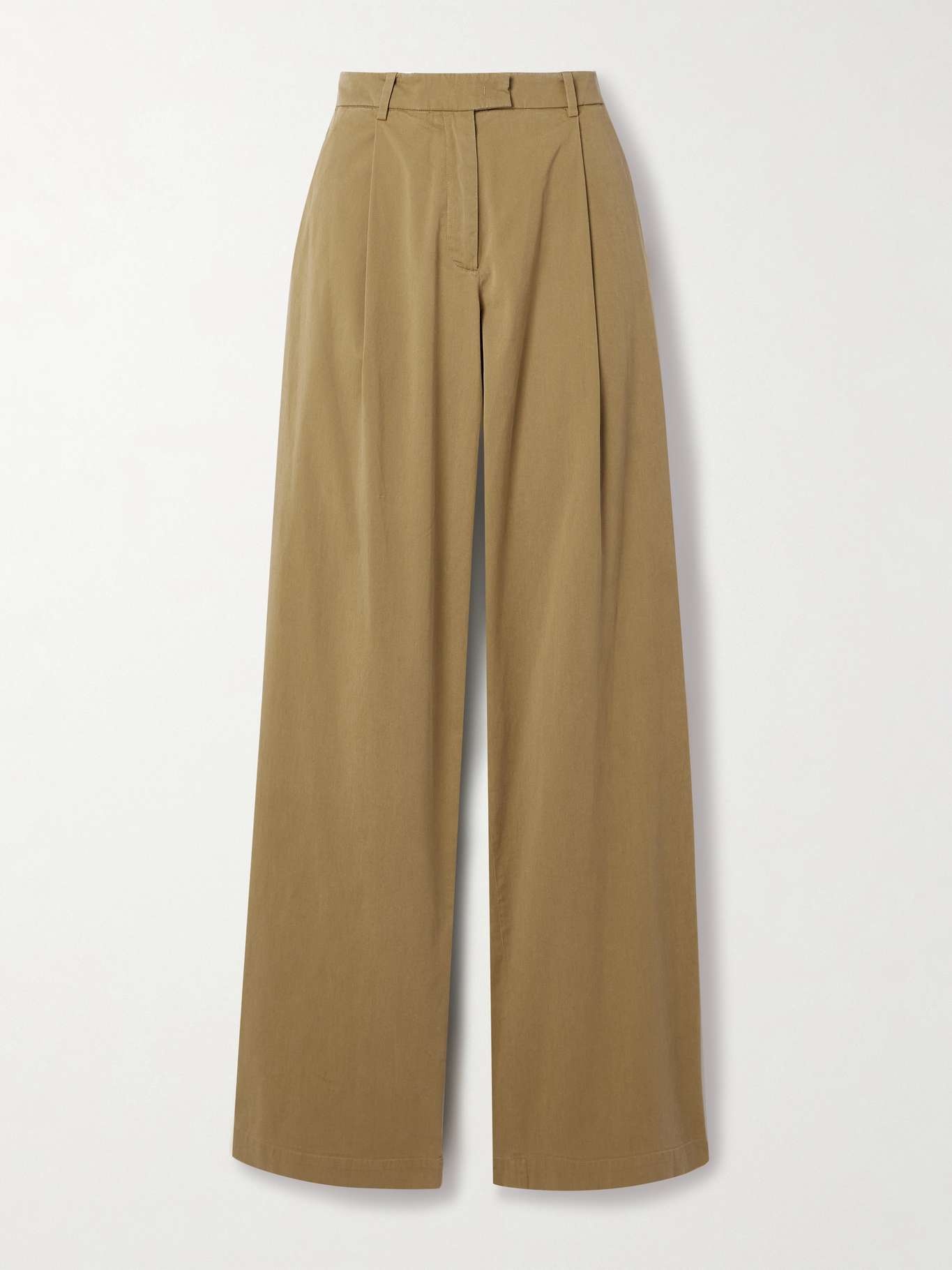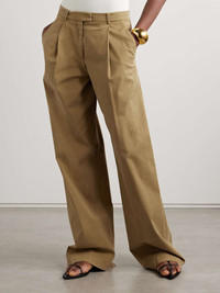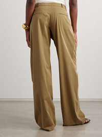 EDITORS'NOTES Another Tomorrow's pants are designed with wide legs enhanced by sharp pleats and particularly long, floor-pooling hems. Tailored from breathable organic cotton-blend twill, they have a high-rise waist complete with belt loops. Wear them with a fitted tank or equally loose shirting. SIZE & FIT Model measurements: - Fits true to size, however those who are between sizes should take the smaller size - Mid-rise, designed for a wide-leg fit - Slightly long in length - Mid-weight, stretchy fabric - Model is 175cm/ 5'9" and is wearing an IT 40 - Bust: 79cm/ 31" - Waist: 61cm/ 24" - Hip: 89cm/ 35" DETAILS & CARE - Sand organic cotton-blend twill - Concealed buttons and zip fastening at front - 97% organic cotton, 3% elastane - Designer color: Thyme