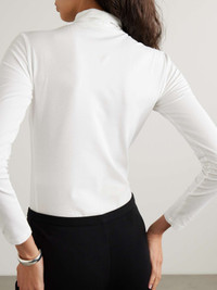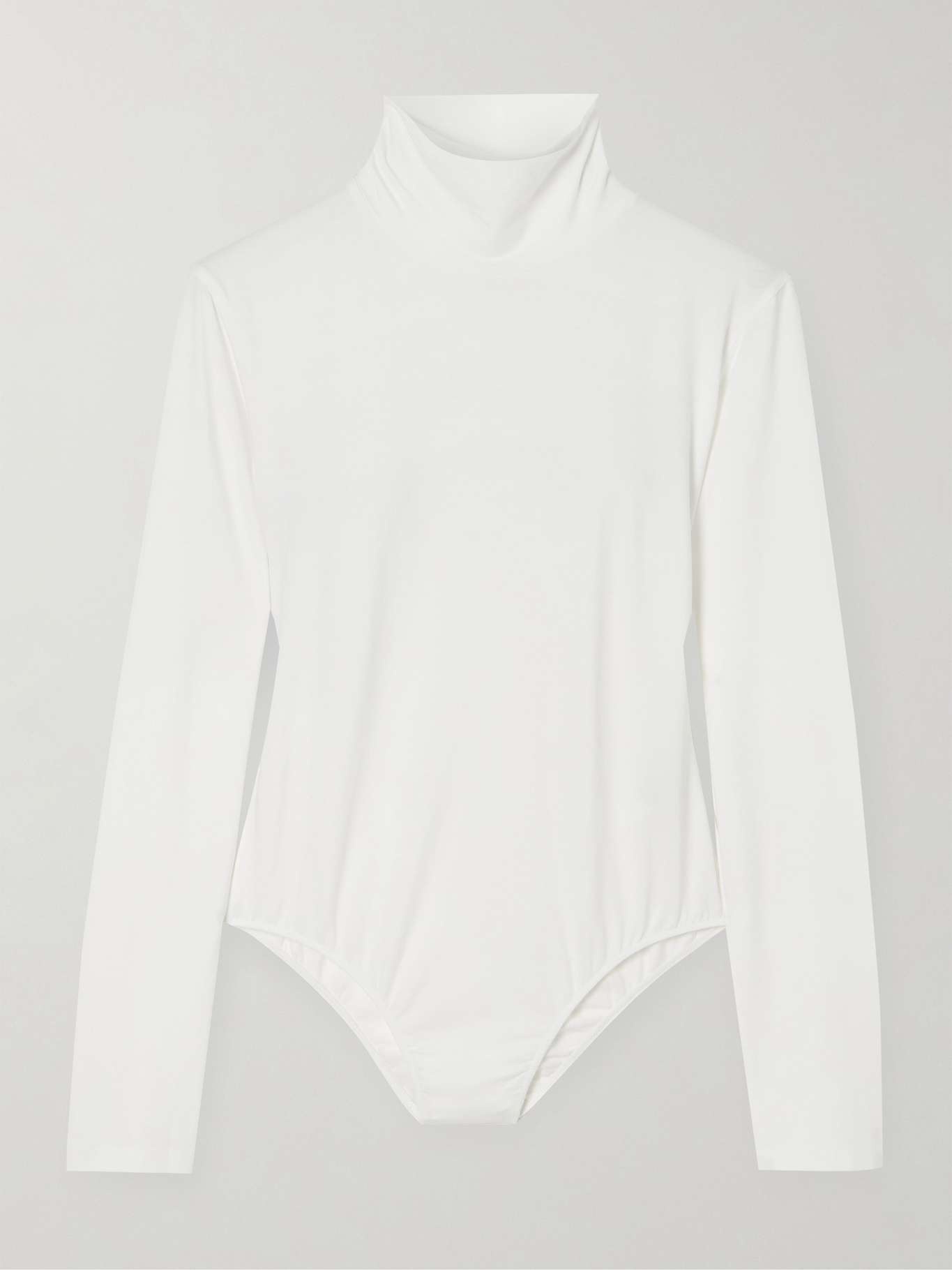 EDITORS'NOTES Another Tomorrow says it is "committed to providing the greatest degree of transparency" where possible for each of its pieces. For example, if you scan the QR code on the care label of this bodysuit, you can discover how it was made. It's cut from stretch-jersey blended with plenty of cotton and soft Lyocell and has a chic turtleneck. Wear yours with the brand's tailoring. SIZE & FIT Model measurements: - Fits true to size, take your normal size - Designed for a close fit - Minimal brief coverage - Mid-weight, stretchy fabric - Model is 180cm/ 5'11" and is wearing a size Small - Bust: 80cm/ 31.5" - Waist: 67cm/ 26" - Hip: 89cm/ 35" DETAILS & CARE - White stretch cotton and Lyocell-blend jersey - Snap fastenings at base - 47% cotton, 47% Lyocell, 6% elastane
