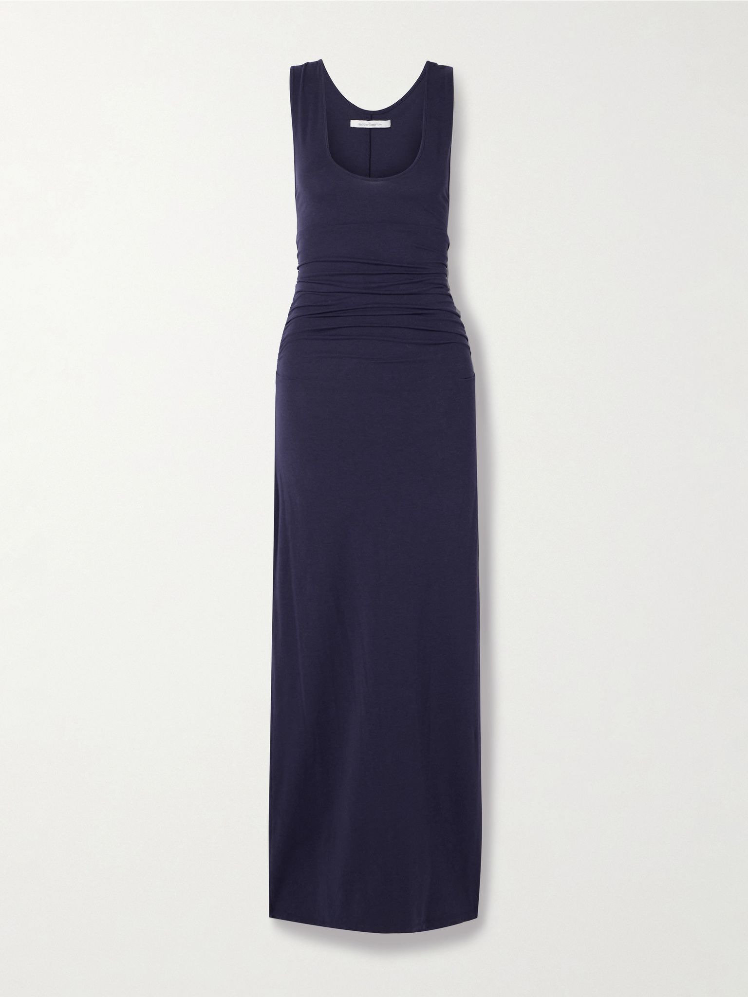 Another Tomorrow is an expert at injecting simple silhouettes with considered details. This maxi dress is cut from smooth stretch-jersey that's ruched along the waist and wide straps. The scooped neckline is perfect for displaying a pendant - the deep indigo shade pairs particularly well with silver. Size & Fit - Fits true to size, take your normal size - Designed for a close fit - Lightweight, stretchy fabric - Model is 175cm/ 5'9" and is wearing a size Small Model measurements: - Bust: 79cm/ 31" - Waist: 61cm/ 24" - Hip: 89cm/ 35" Details & Care - Indigo stretch-jersey - Slips on - 47% TENCEL™ Lyocell, 47% organic cotton, 6% elastane