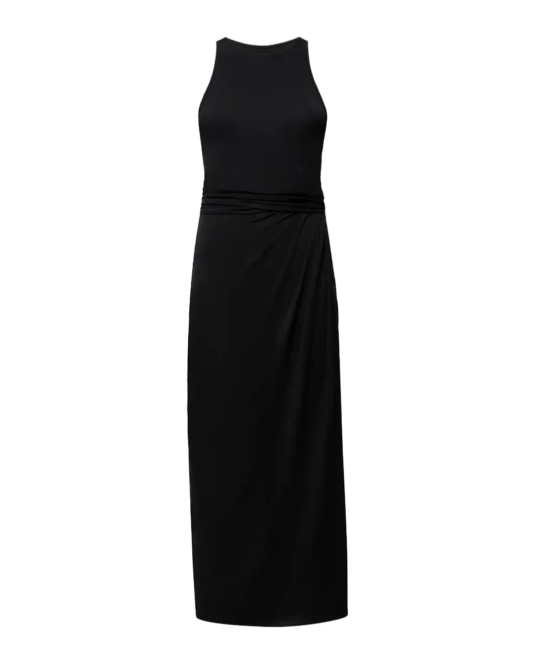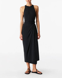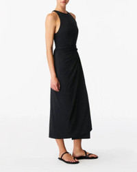 The Sarong Tie Dress in Black by Another Tomorrow is a slip on midi dress featuring an adjustable wrap front detail crafted in a lightweight blend of cotton, lyocell, and elastane. This custom fabric features a premium organic cotton expertly knit together with lyocell. The lyocell in this fabric uses wood pulp from FSC-certified suppliers ensuring the protection of ancient and endangered forests. During fiber production, special attention is placed on a closed loop cycle, reducing and recovering the water, chemicals, and energy used. - Model is 5'10 and wearing a size S. - 47% Lyocell, 47% Cotton, 6% Elastane - No Closures, Slips On - Functioning Wrap, Adjustable - Midi Length - Unlined - Hand Wash Cold Or Dry Clean Sparingly