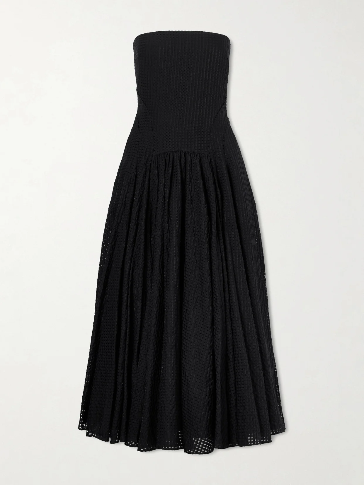 Intent on doing things differently, Another Tomorrow brings a subversive edge to textiles, designing each piece to make a lasting impression. Woven with a gingham-like texture, this dress has a dropped waist and internal boning for structure. The strapless neckline frames your decolletage; while the pleated skirt creates fluid movement. Large to size. See Size & Fit notes. Lower-Impact Materials. This product is made using at least 50% lower-impact materials or ingredients. Find out more about our NET SUSTAIN criteria here.
