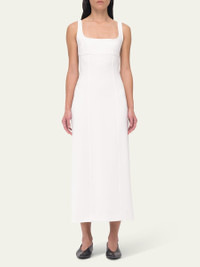 Another Tomorrow dress features two oval back cutouts fastened by self-ties Approx. 48"L from shoulder to hem Square neckline Wide straps Vertical front seams elongate and slim Back vent Hem falls below the knee Sheath silhouette Slipover style Viscose/elastane Dry clean Made in Italy Model is 5'10"/177cm. Online Inquiries: BGS21_B929U| Store Inquiries: #4727270