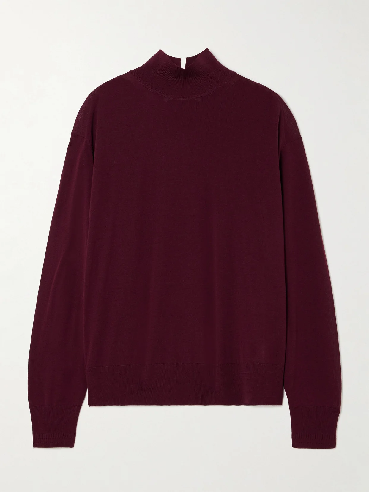 Another Tomorrow's sweater is knitted from certified wool with a feather-light handle and slightly sheer finish. In a burgundy shade the label calls 'Aubergine'; it has a cozy turtleneck and ribbed trims to temper the relaxed shape. Underpin yours with a tank or bralette. Lower-Impact Materials. This product is made using at least 50% lower-impact materials or ingredients. Find out more about our NET SUSTAIN criteria here.
