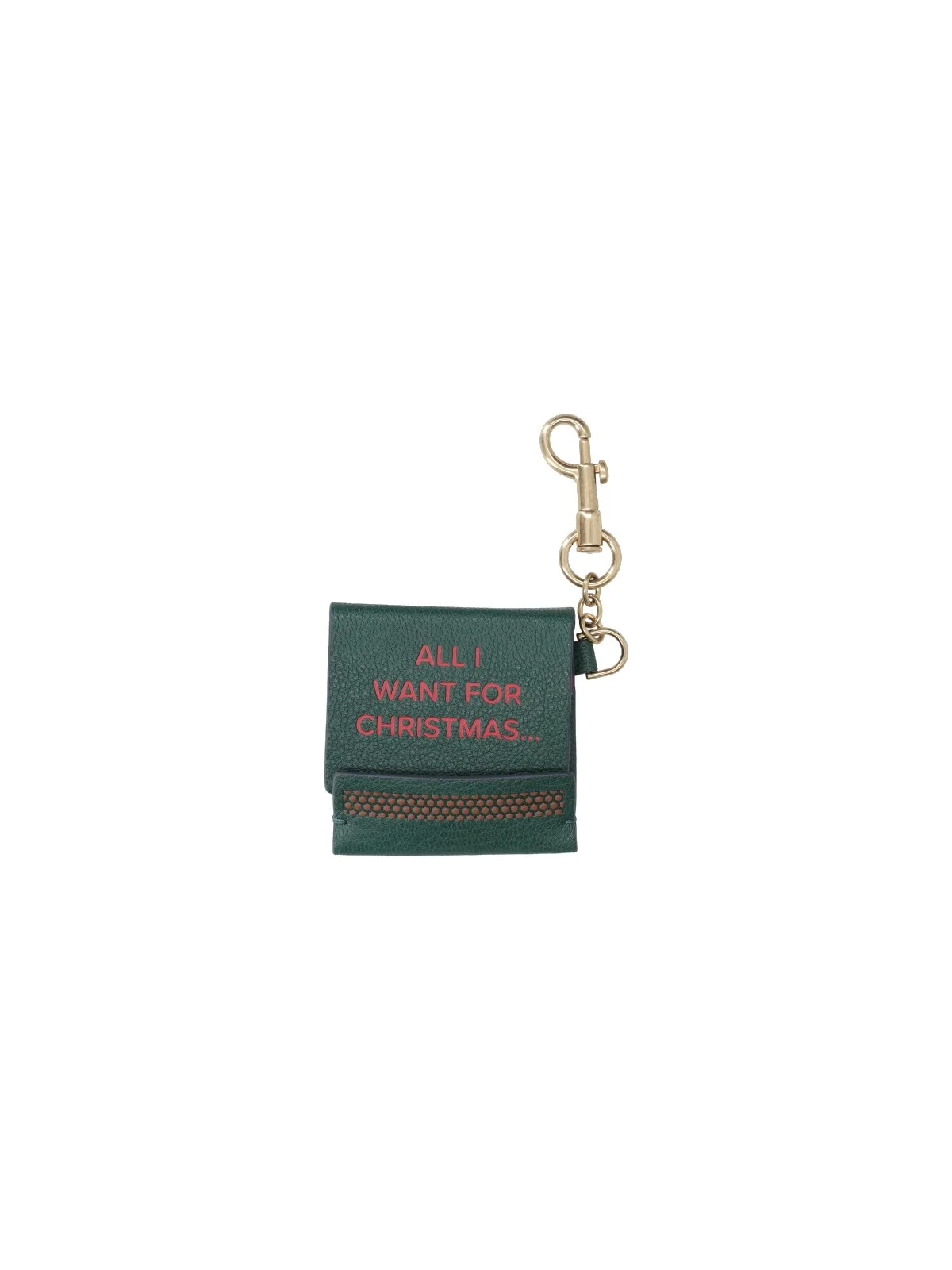 ANYA HINDMARCH 'ALL I WANT FOR CHRISTMAS...' KEYRING IN GREEN GOAT LEATHER WITH CONTRASTING INNER DETAILS, KEYRING AND GOLD METAL SNAP HOOK. PRODUCT INFO PRODUCT CODE 205511MIDNIGHT GREEN COMPOSITION: 100% GOAT LEATHER MADE IN: CHINA