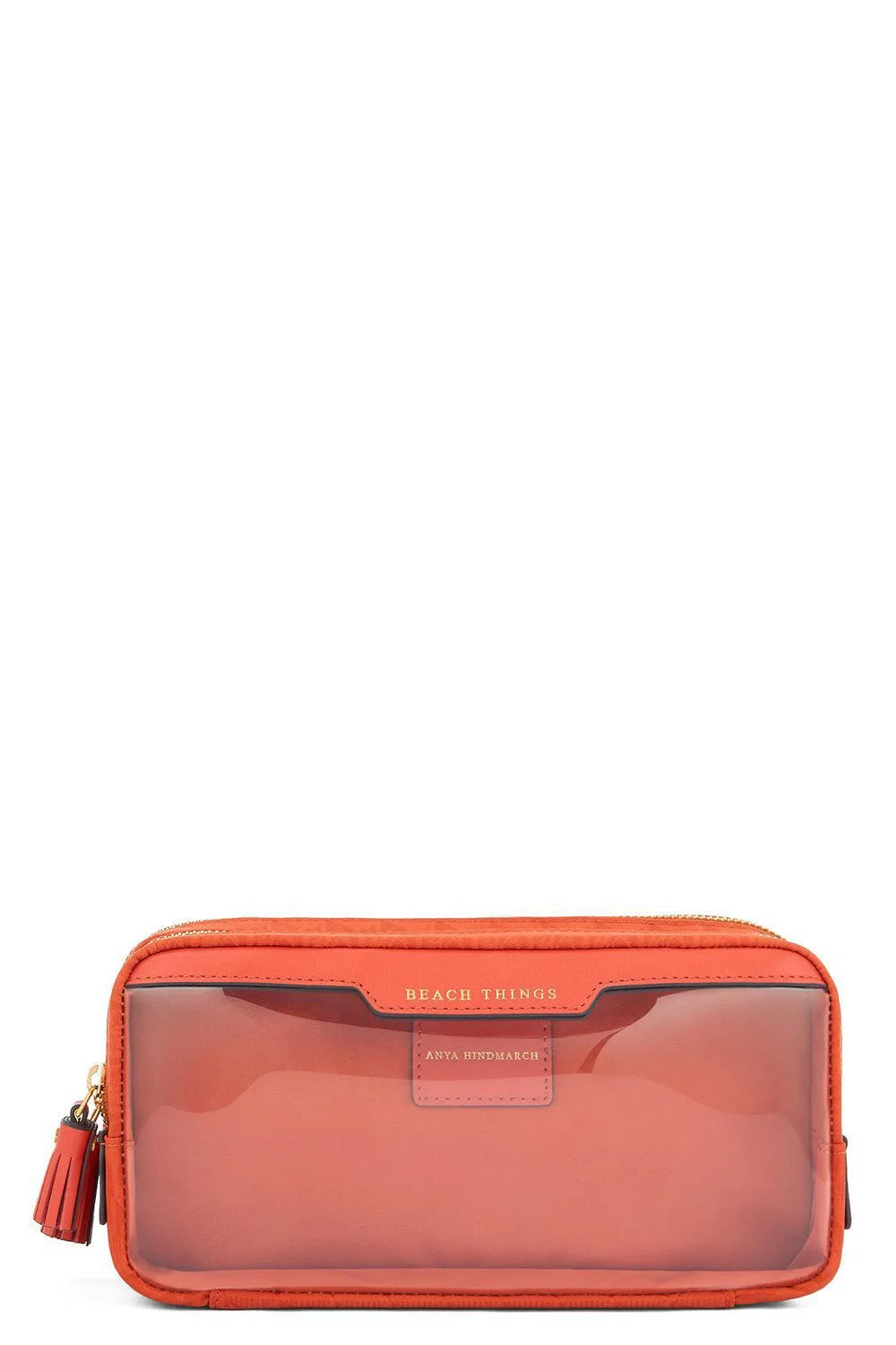 DETAILS AND INSIGHT Anya Hindmarch beach things pouch in burnt sienna. Jacquard Nylon, Calf Leather H11cm x W21cm x D7cm Fits Iphone 16 Pro Max External features: Embossed BEACH THINGS and SUNCREAMS labels, double tasseled zips, all-over AH logo, clear-pane compartment Internal features: Two separate compartments for your essentials such as earphones, keys or suncream Imported Style 5050925197403-BURNT SIENNA