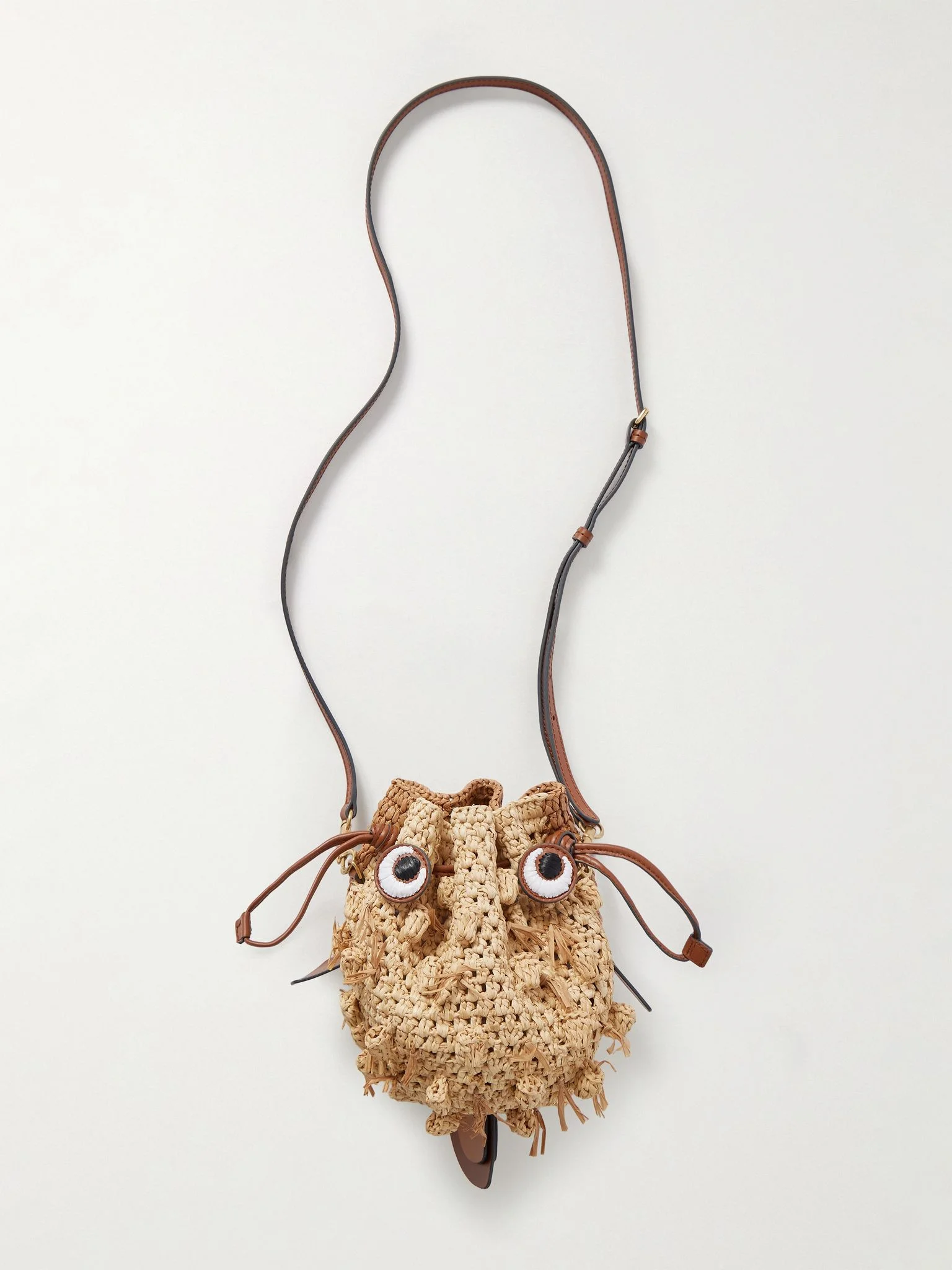 In true Anya Hindmarch style, this bag is playfully designed to resemble a 'Blowfish'. It's handwoven from raffia with leather trims, and holds enough space inside for your phone, cardholder and lip balm. Details & Care - Neutral, black and white raffia, brown leather (Calf) - Detachable adjustable shoulder strap - Unlined - Drawstring top - Comes with dust bag