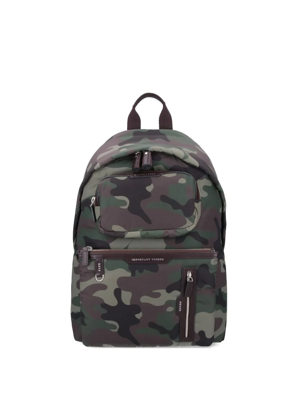camouflage multi pocket backpack Highlights - Green - Camouflage pattern - Top handle - Adjustable shoulder straps - Front zip pockets - Zip fastening Imported Composition Outer: Polyester 70%, Recycled Polyester 30% SIZE & FIT Measurement DEPTH 6.29 in(16 cm) HEIGHT 15.74 in(40 cm) WIDTH 11.41 in(29 cm)