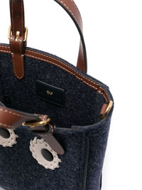 mini Eyes tote bag Highlights - Navy blue/brown - Recycled wool - Faux-leather trim - Felted - Anya eyes motif - Two adjustable top handles - Adjustable detachable shoulder strap - Main compartment - Internal logo patch - Gold-tone hardware - Open top - This piece comes complete with a protective dust bag. Made in Italy Composition Outer: Recycled Wool 100%, Artificial Leather 100% SIZE & FIT Model measurements Height 5 ft 11 in(1.8 m) Bust/Chest 32.67 in(83 cm) Hips 36.22 in(92 cm) Waist 24.4 in(62 cm) Measurement DEPTH 2.36 in(6 cm) HANDLE 3.93 in(10 cm) HEIGHT 7.87 in(20 cm) STRAP 48.03 in(122 cm) WIDTH 6.69 in(17 cm)