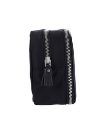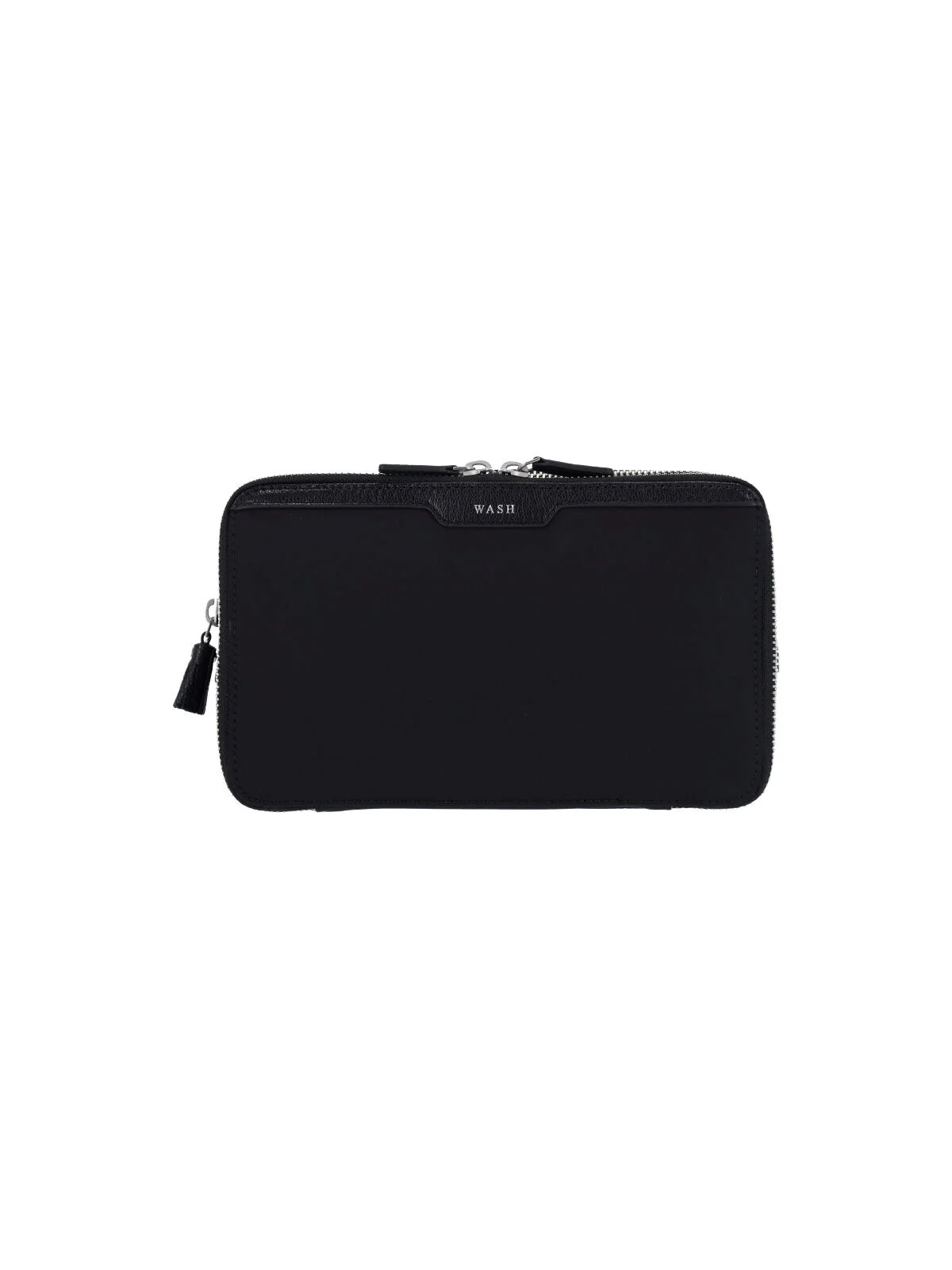 ANYA HINDMARCH 'WASH BAG' POUCH IN BLACK NYLON WITH LEATHER TRIM, DOUBLE ZIP CLOSURE, ZIPPER TASSEL DETAIL, GOLD LOGO EMBOSSED ON THE FRONT, INNER FLAT POCKET, INNER ZIP POCKET, TWO SEPARATE INNER COMPARTMENTS. PRODUCT INFO PRODUCT CODE 194594BLACK COMPOSITION: 100% NYLON SIZE AND FIT: H 15 X W 9.5 X D 5 CM MADE IN: CHINA - TRIMS: 100% LEATHER - PRODUCT MADE FROM RECYCLED MATERIALS