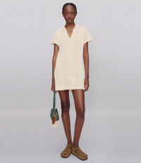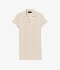 - Heavyweight material with subtle openwork. - Straight cut. - Mid-thigh length. - V-neck polo shirt collar. - Short sleeves. - This garment is GOTS-certified which guarantees the organic origin of this clothing and the compliance with strict social and environmental criteria throughout the production chain. - GOTS-certified product (No. 214416/EGL) - Organic textile. - Same fabric also available in: Ophelia polo shirt Size Advice - Grace is 5'10 tall and is wearing size S. - This item sizes normally. We recommend that you select your usual size. Composition & Material - 100% cotton. - Portuguese material. - Made in Portugal. - Machine wash cold (86°F) inside-out.