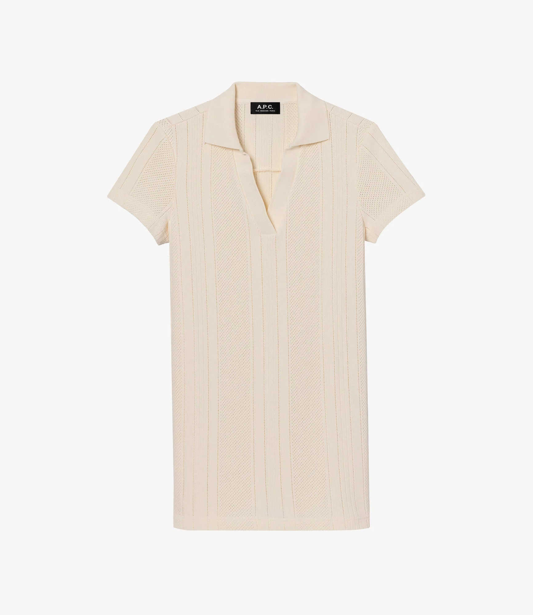 - Heavyweight material with subtle openwork. - Straight cut. - Mid-thigh length. - V-neck polo shirt collar. - Short sleeves. - This garment is GOTS-certified which guarantees the organic origin of this clothing and the compliance with strict social and environmental criteria throughout the production chain. - GOTS-certified product (No. 214416/EGL) - Organic textile. Size Advice - Grace is 5'10 tall and is wearing size S. - This item sizes normally. We recommend that you select your usual size. Composition & Material - 100% cotton. - Portuguese material. - Made in Portugal. - Machine wash cold (86°F) inside-out.