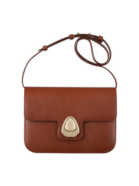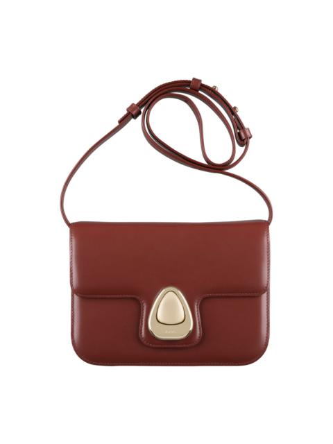 PRODUCT DETAILS A.P.C. Women's bag. - Handbag with a jewelry-style clasp with 80s inspiration. - Soft cowhide leather. - Adjustable leather strap. May be carried on shoulder or across chest. - Goldtone magnetic clasp. - Flap lined in cowhide suede split. - Two compartments and one pocket on interior. - Embossed goldtone A.P.C. logo on clasp. - Available in a smaller version, the Astra Small bag. FABRIC & CARE - 100% Leather. - Spanish material. - Made in Morocco. - We recommend protecting this leather from sunlight, heat and water. - In case of stains, dry immediately with a soft cloth. SIZE - Dimensions: 10.6 x 5.1 x 2.4".