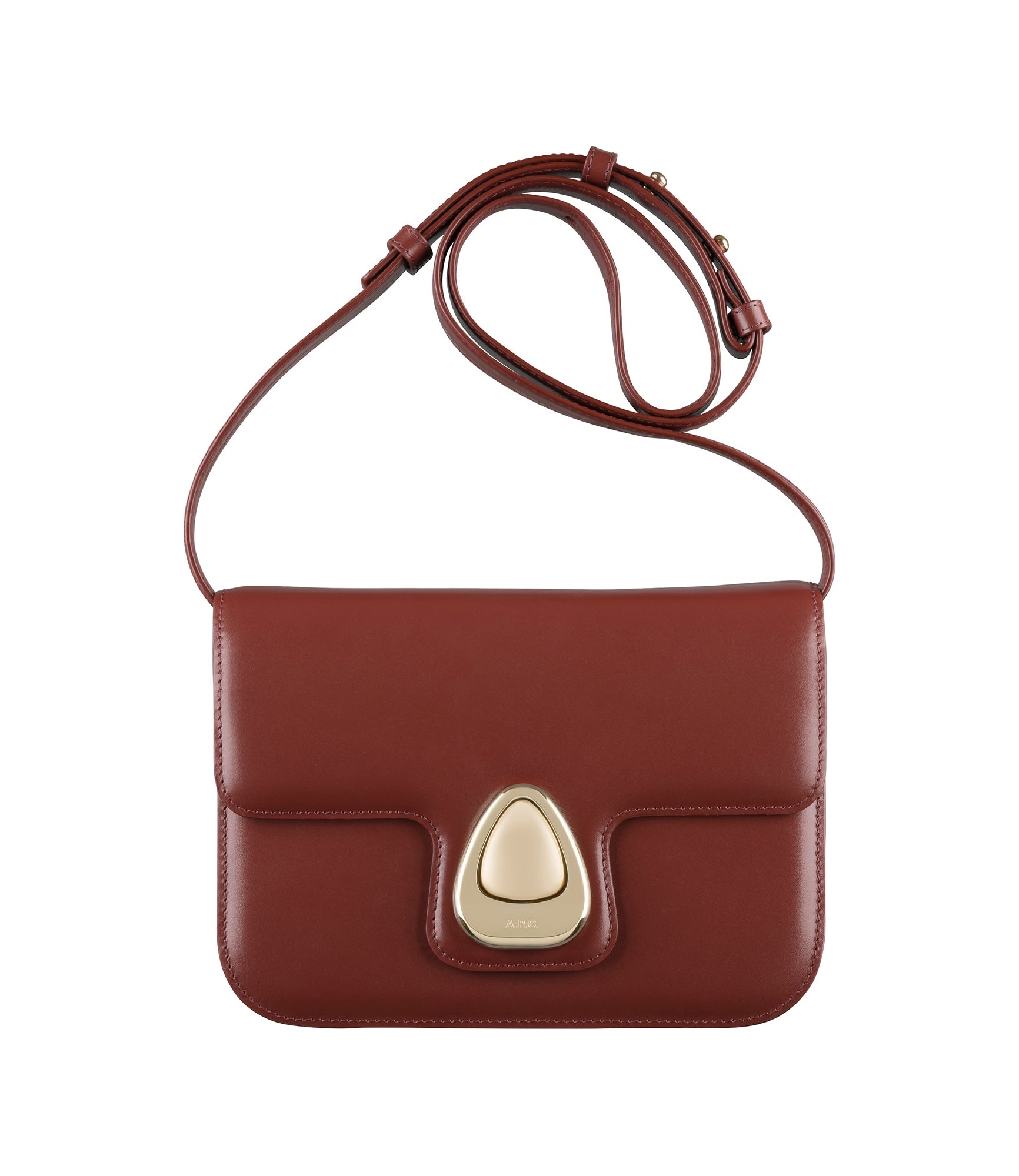 A.P.C. Women's bag. - Handbag with a jewelry-style clasp with 80s inspiration. - Soft cowhide leather. - Adjustable leather strap. May be carried on shoulder or across chest. - Goldtone magnetic clasp. - Flap lined in cowhide suede split. - Two compartments and one pocket on interior. - Embossed goldtone A.P.C. logo on clasp. - Available in a larger version the Astra bag. Size Advice - Dimensions: 8.4 x 5.9 x 2.7. Composition & Material - 100% cowhide leather. - Spanish material. - Made in Morocco. - We recommend protecting this leather from sunlight heat and water. - In case of stains dry immediately with a soft cloth. Our commitments Through its RESPECT program A.P.C reduces (by implementing many practical measures to improve its environmental footprint) regulates (by respecting and enforcing its ethical responsibility on the part of its employees as well as its suppliers) and reuses (through its recycling vintage or quilts and butler programs for example).