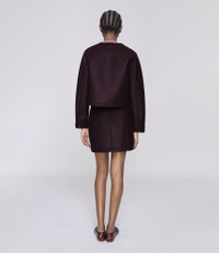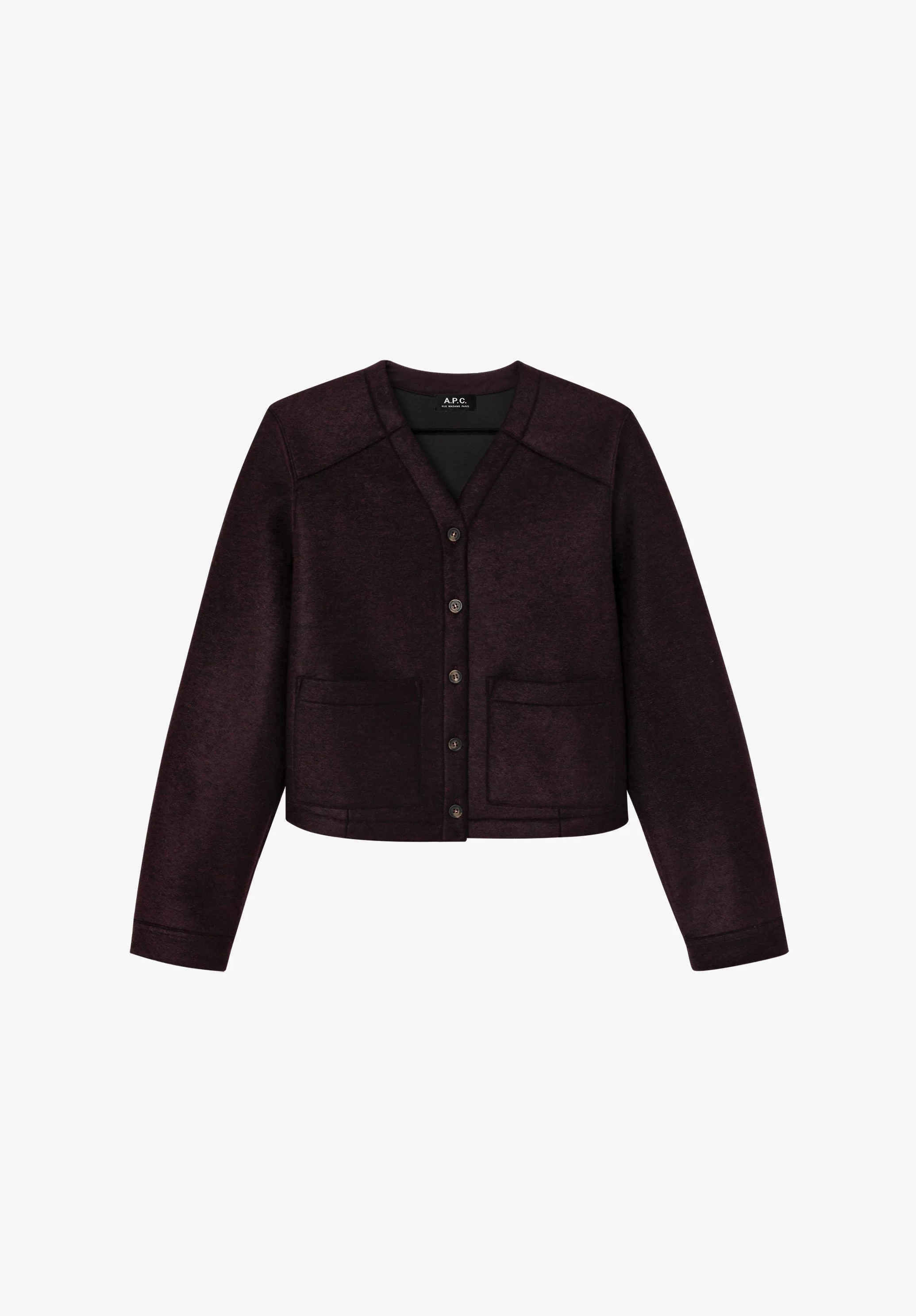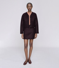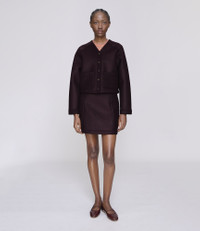 - Structured felted neoprene material. - Straight cut. - V-neck. - Closes with faux horn buttons. - Two side pockets. Size Advice - Grace is 5'10 tall and is wearing size S. Composition & Material - 50% recycled polyester. 35% acrylic-polyacrylic. 15% wool. - Italian material. - Made in Portugal. - Machine wash cold (86°F) inside-out.