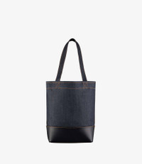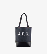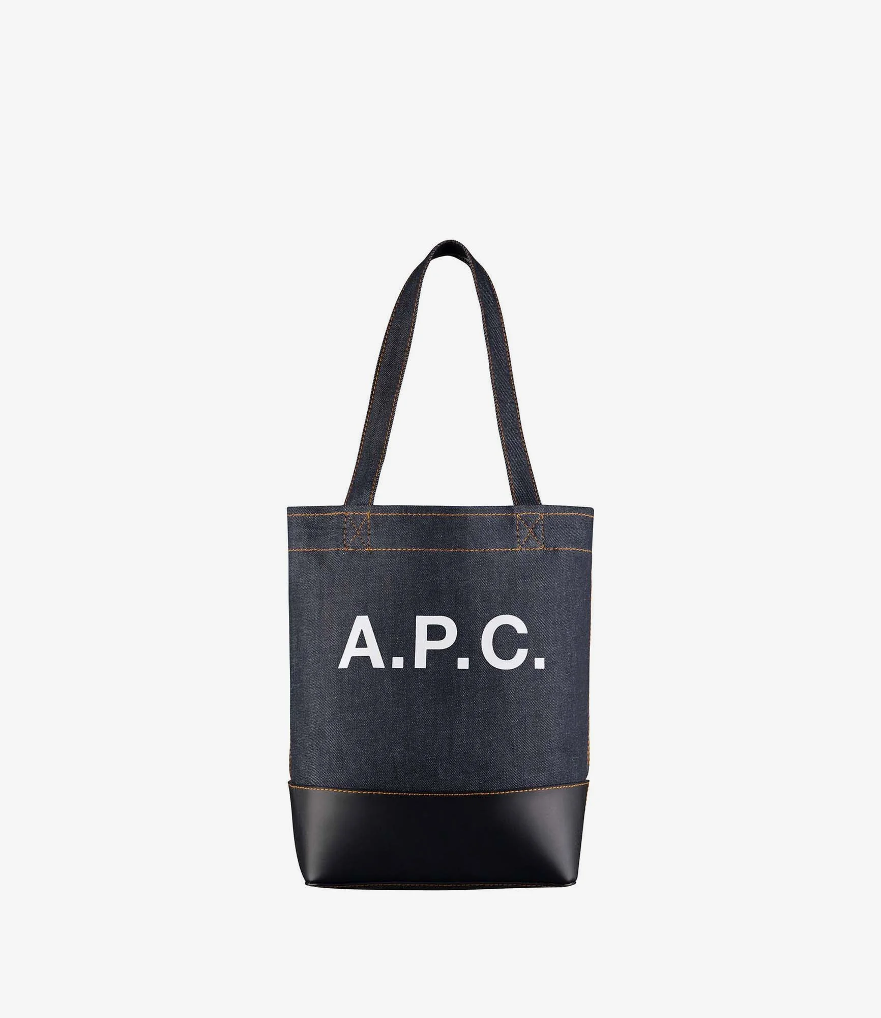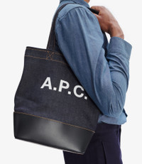 A.P.C. tote bag. - Tote bag in Japanese denim. - Two large handles. May be carried on shoulder or by hand. - Wide band in smooth leather on bottom of bag. - Reinforced base. - Interior zip pocket. - Large A.P.C. logo in front. - Caramel topstitching on the denim. - Small version of the Axelle tote bag. Size Advice - Dimensions: 8.6 x 12 x 4.7. Composition & Material - 98% cotton. 2% polyurethane. - 100% leather. - Made in Mauritius.