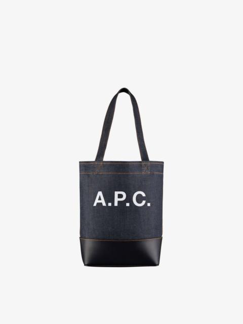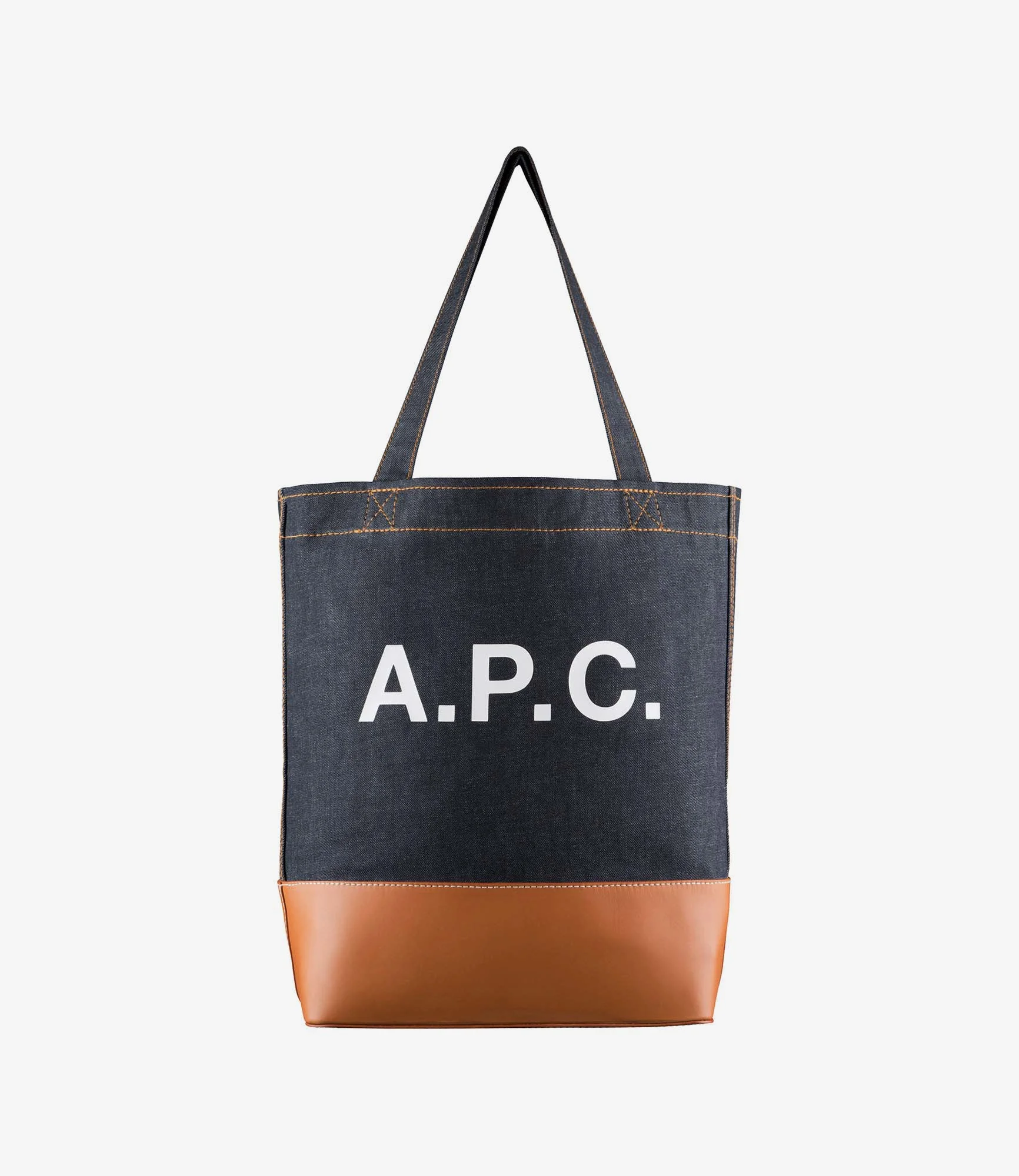 A.P.C. tote bag. - Tote bag in Japanese canvas. - Two large handles. May be carried on shoulder or by hand. - Wide band in smooth leather on bottom of bag. - Reinforced base. - Interior zip pocket. - Large A.P.C. logo in front. - Caramel topstitching on the denim. Size Advice - Dimensions: 15.74 x 15.55 x 5.51 in. Composition & Material - 98% cotton. 2% polyurethane. - 100% cowhide leather trim. - Made in Mauritius.