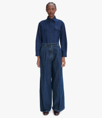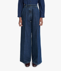 - High rise. - Very long wide legs. - Two large front pleats. - Two side pockets and one back pocket. - Guitar and dagger button. - Zip fly. - Caramel topstitching. - 100% recycled cotton. Size Advice - Grace is 5'10 tall and is wearing size 36. - This item sizes normally. We recommend that you select your usual size. Composition & Material - 100% cotton. - Made in Portugal. - Machine wash cold (86°F) inside-out.