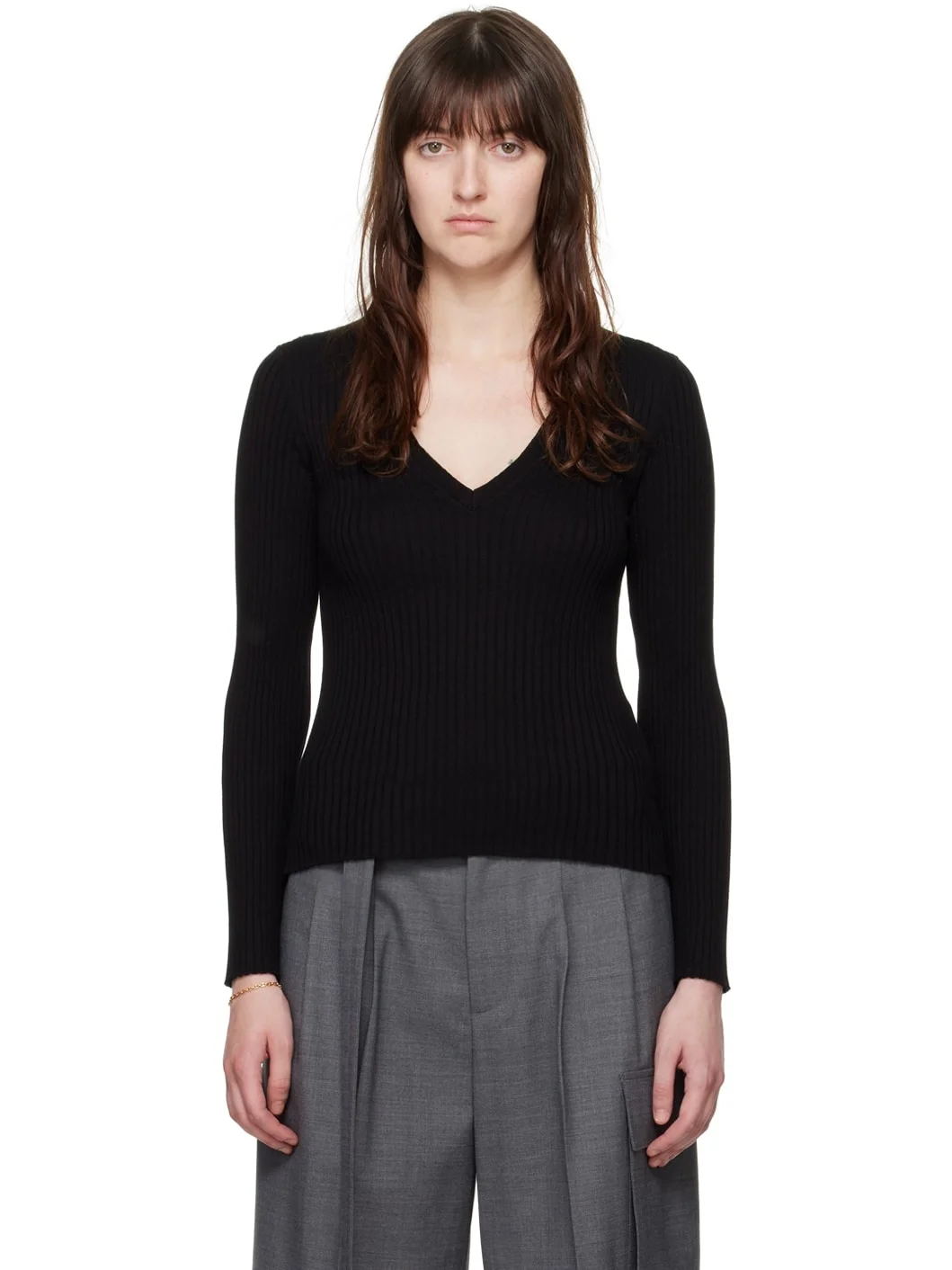 Rib knit cotton sweater. V-neck. Part of the A.P.C. x Katie Holmes collaboration. Supplier color: Black 100% cotton. Made in Italy 242252F100002