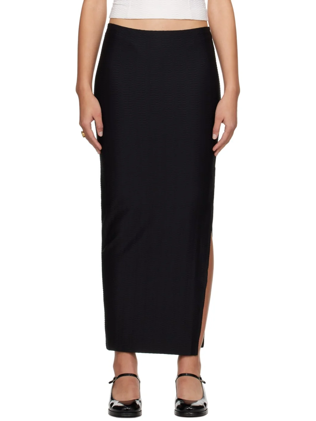 Textured stretch nylon jersey skirt. · Elasticized waistband · Vented side seam Supplier color: Black 83% polyamide, 17% elastane. Made in Portugal 241252F093000