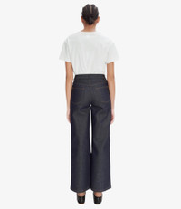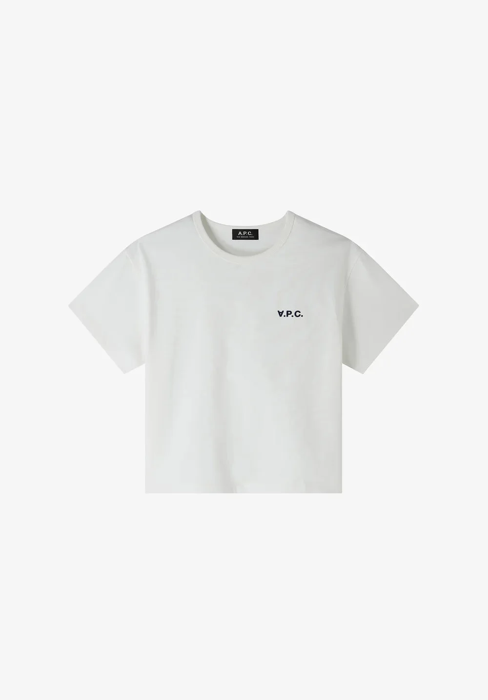 A.P.C. Women's t-shirt. - Wide boxy fit. Size down 1 if between sizes or regular fit is desired. - Short wide cut. - Crew neck. - Flocked velvet-feel V.P.C. over the heart. - 100% organic cotton. Composition & Material - 100% cotton. - Portuguese material. - Made in Portugal. - Machine wash cold (86°F) inside-out.