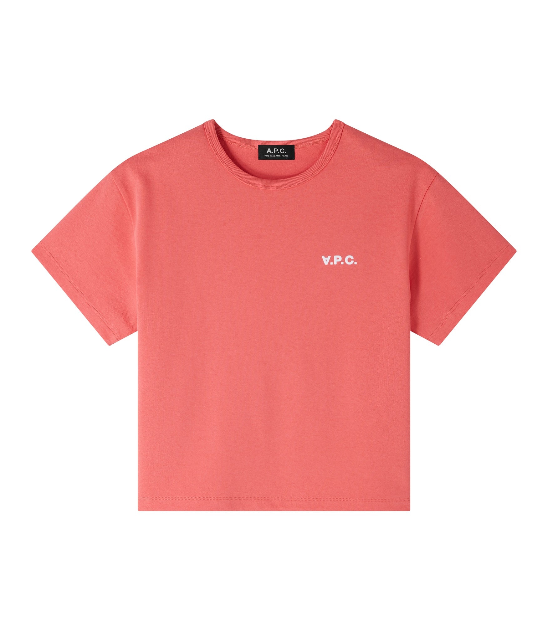 A.P.C. Men's t-shirt. - Wide boxy fit. Size down 1 if between sizes or regular fit is desired. - Short wide cut. - Crew neck. - Flocked velvet-feel V.P.C. over the heart. - 100% organic cotton. Size Advice - Sofi is 5'10 tall and is wearing size S. - Wide boxy fit. Size down 1 if between sizes or regular fit is desired. Composition & Material - 100% cotton. - Portuguese material. - Made in Portugal. - Machine wash cold (86°F) inside-out.