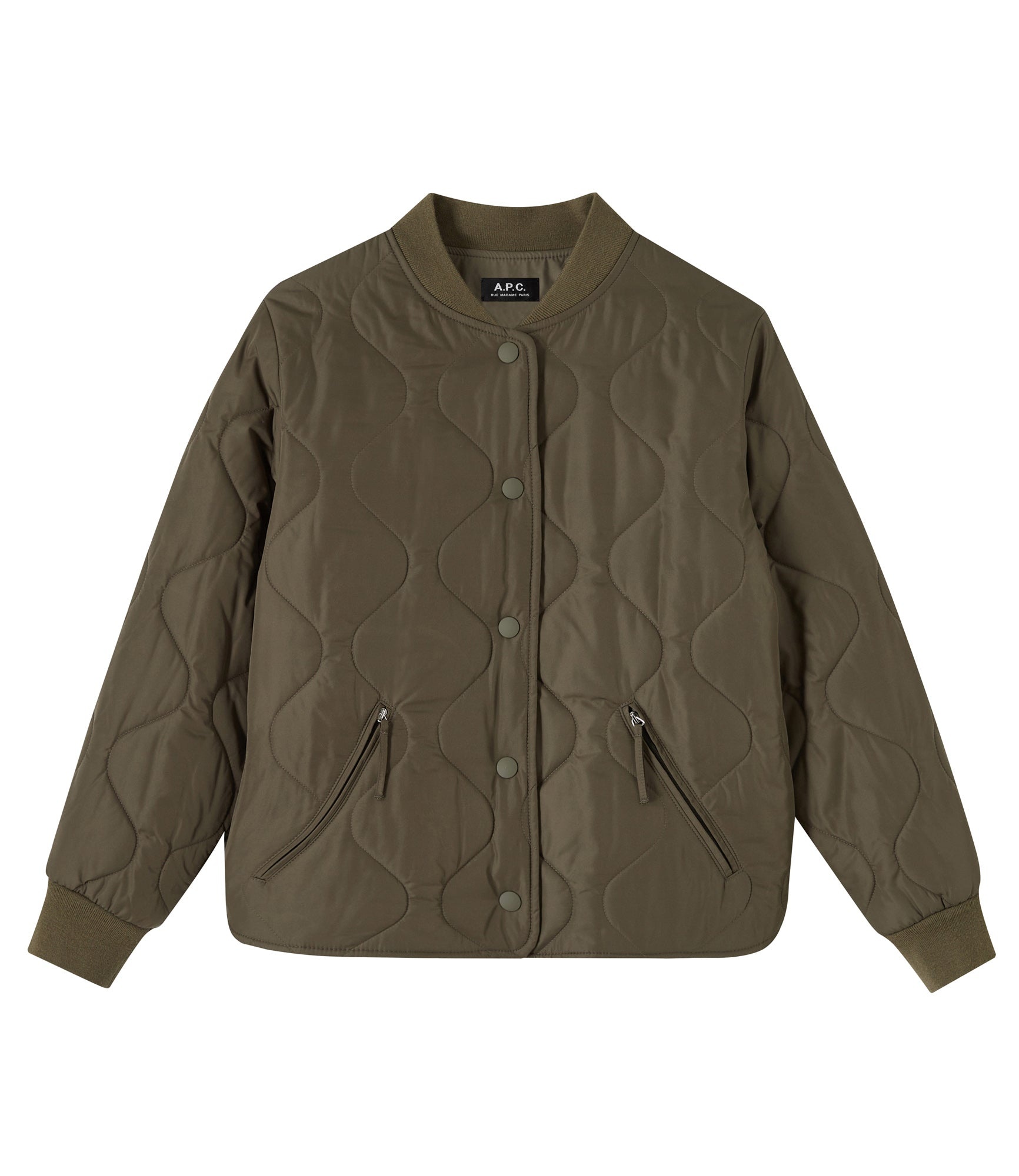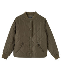 - Straight cut. - Soft collar. - Two zip pockets. - Closes with tone-on-tone rubber snap buttons. - A.P.C. label on the right side. - 100% recycled polyester. Size Advice - Licett is 5'10 tall and is wearing size 36. Composition & Material - 100% polyester. - Italian material. - Made in Romania. - Dry clean only.