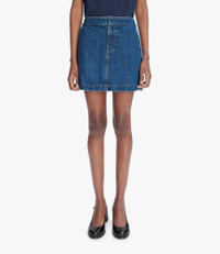 - Japanese denim canvas material. - Mid-rise. - Straight cut. - Mid-thigh length. - V-neckline in back. - Two back pockets one with a workwear-style A.P.C. label. - Zip fly. - 100% organic cotton. Size Advice - Grace is 5'10 tall and is wearing size 36. Composition & Material - 100% organic cotton. - Japanese material. - Made in Vietnam. - Machine wash cold (86°F) inside-out.
