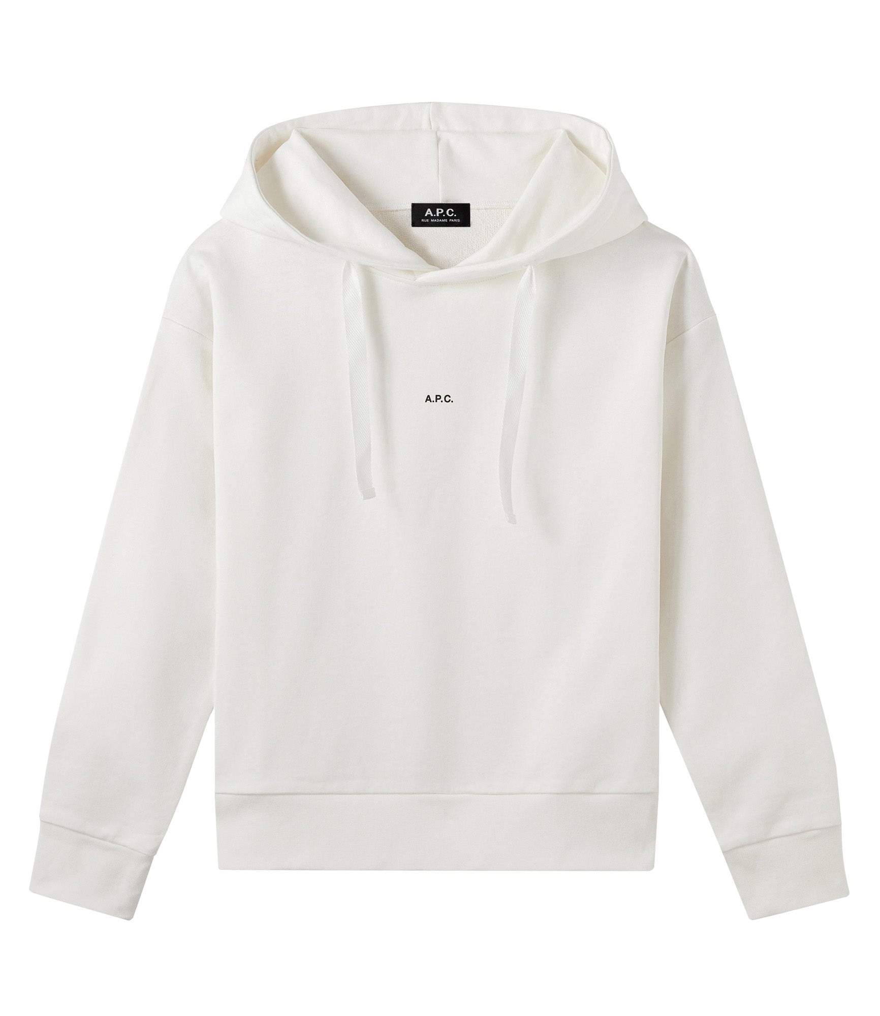 A.P.C. Women's hoodie. Loose cut. Sloping shoulders and wide sleeves. Black A.P.C. micro-logo centered in front. Tone-on-tone drawstring. 100% cotton derived from organic farming. - Size Advice This item sizes normally. We recommend that you select your usual size. Composition & Material - 100% cotton. - Portuguese material. - Made in Portugal. - Machine wash cold (86°C) inside-out. Our commitments Through its RESPECT program A.P.C reduces (by implementing many practical measures to improve its environmental footprint) regulates (by respecting and enforcing its ethical responsibility on the part of its employees as well as its suppliers) and reuses (through its recycling vintage or quilts and butler programs for example).