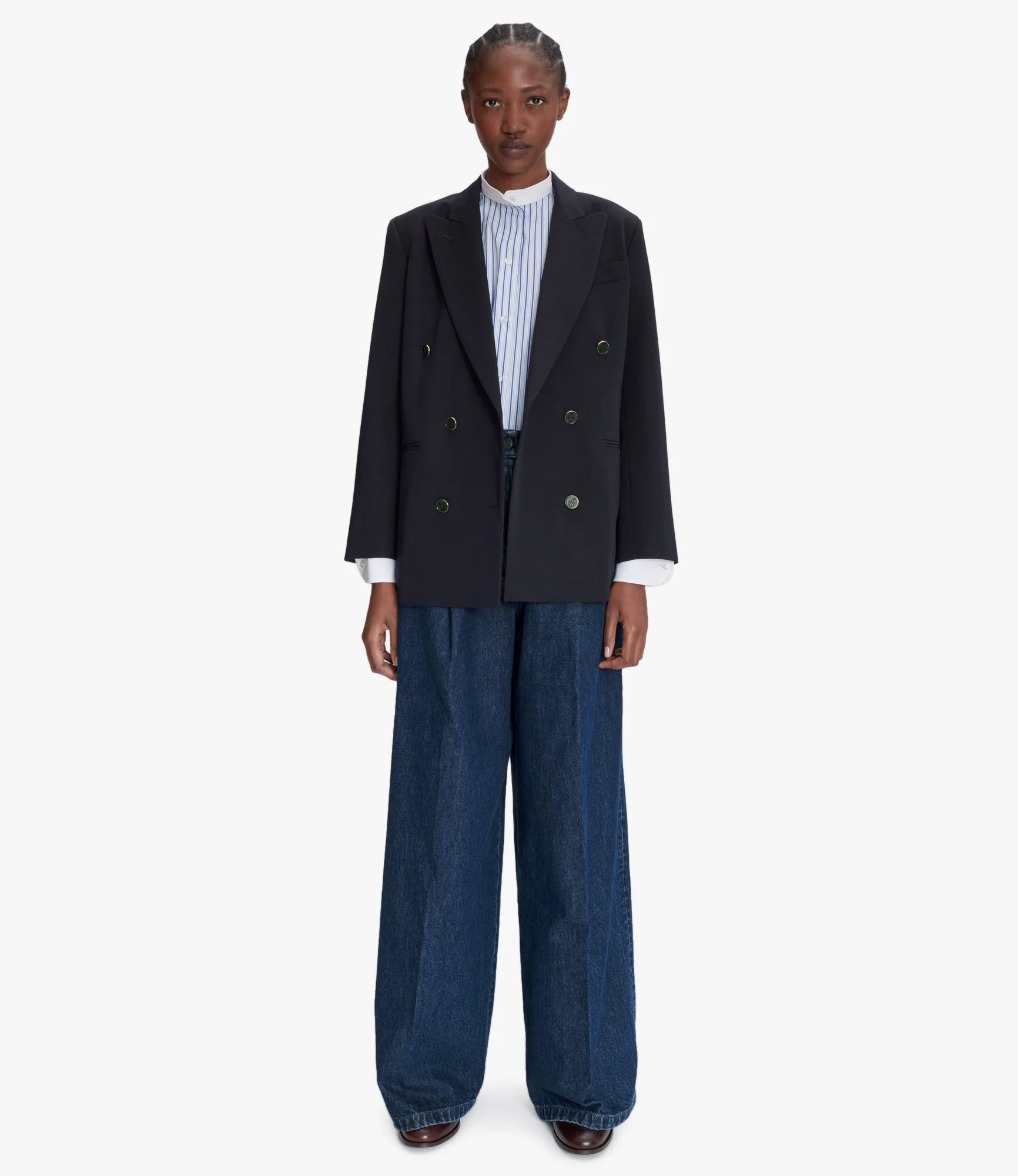 A.P.C. x Anastasia Barbieri interaction jacket. - Smooth chic Italian material. - Straight structured cut with shoulder pads. - Tailored collar. - Six dark green buttons engraved with Anastasia Barbieri's coat-of-arms with a goldtone trim. - One pocket over the heart and two on the sides. - Buttoned cuffs. - Lined jacket. Size Advice - Grace is 5'10 tall and is wearing size 36. - This item sizes normally. We recommend that you select your usual size. Composition & Material - 40% cotton. 31% polyester. 27% wool. 2% elastane. - Italian material. - Made in Romania. - Dry clean only.