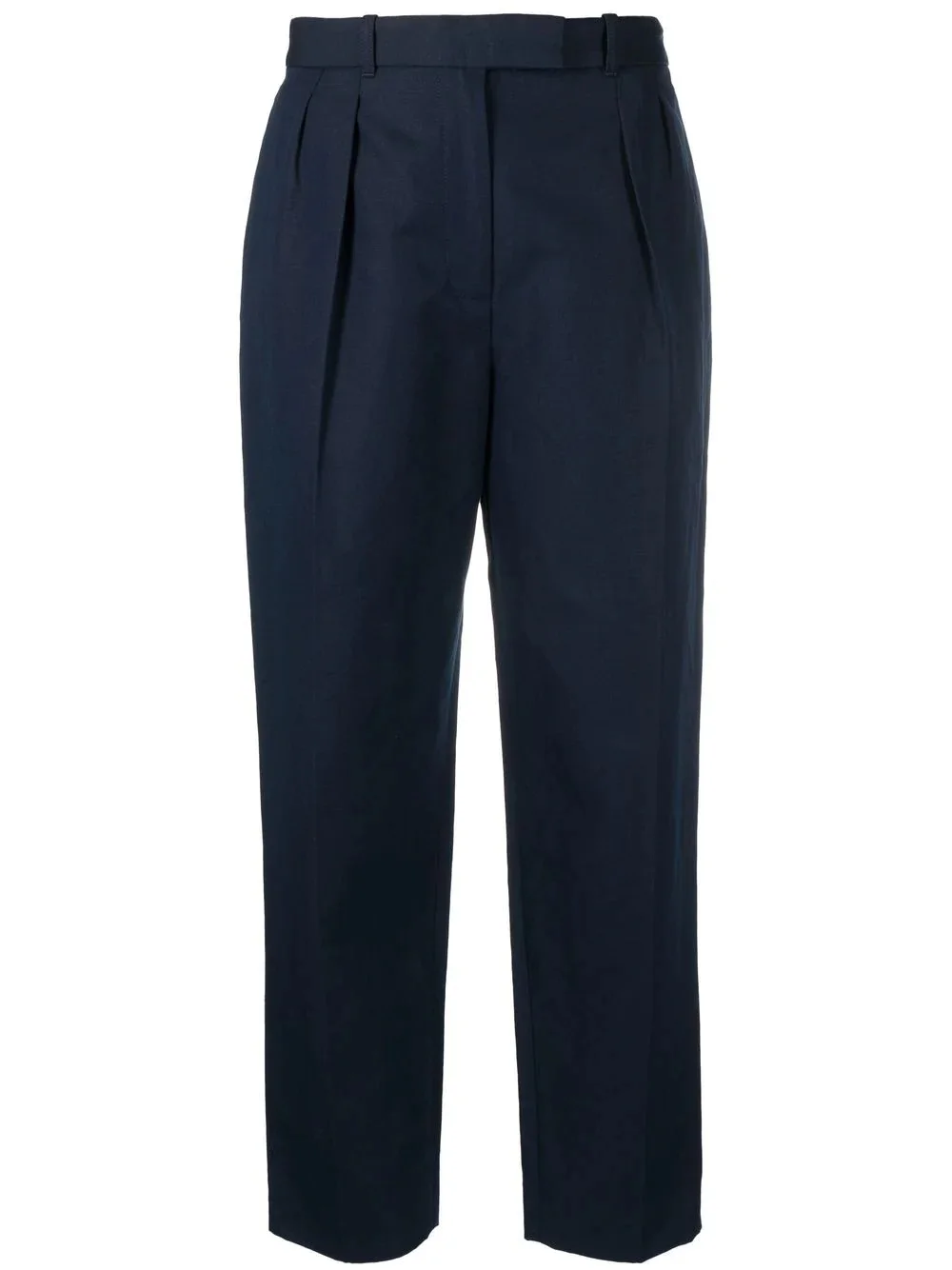 concealed-front fastening trousers navy blue linen/flax-cotton blend belt loops concealed front fastening two side inset pockets two rear welt pockets Imported Composition Cotton 62%, Linen/Flax 38% SIZE & FIT Model measurements Height 5 ft 10 in(1.78 m) Bust/Chest 33.46 in(85 cm) Hips 36.22 in(92 cm) Waist 23.22 in(59 cm) FittingInformation This piece fits true to size. We recommend you get your regular size Designed to be fitted at the waist and hips, loose over the leg Made with a mid-weight non-stretch fabric Washing instructions Dry Clean Only