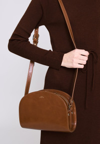 - Iconic A.P.C. bag in crinkled leather. - Goldtone zip closure and double leather zip pulls. - Interior pocket. - Shoulder strap adjusts with a metal buckle. - Can be worn on the shoulder or across the chest. - Goldtone rivets on the sides. - Embossed goldtone A.P.C. Rue Madame Paris logo. Size Advice - Cotton lining. - Shoulder strap: 50 cm. - Dimensions: 24 x 20 x 8.5 cm. Composition & Material - 100% cowhide leather. - Italian material. - Made in Portugal. - Care instructions: wipe with a soft dry cloth. - Avoid poor weather conditions which can potentially damage the leather.