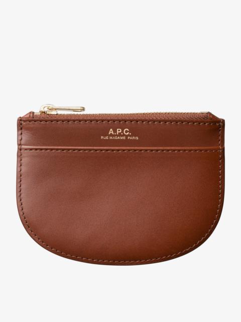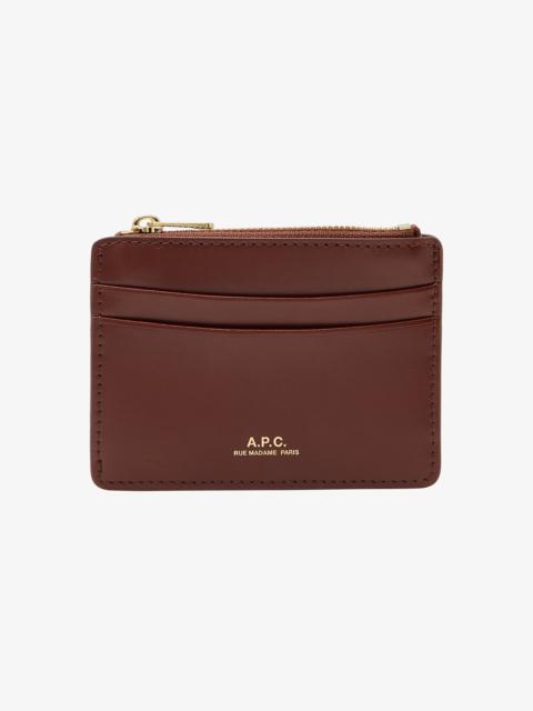 A.P.C. Women's cardholder. - Two card slots on each side. - One multifunction pocket in the center. - Rounded corners. - Embossed goldtone 'A.P.C. Rue Madame Paris' logo. Size Advice - Dimensions: 3.9 x 3.2. - Cardholder with a payment card format. Composition & Material - 100% cowhide leather. - Spanish material. - Made in Spain. - Vegetable-tanned leather is produced with natural tannins. - Marks and traces that will develop on the leather are normal and are part of its natural patina process. Light colors will darken as well. - Leather must be protected from the sun heat and water. - Care instructions: wipe with a soft dry cloth.